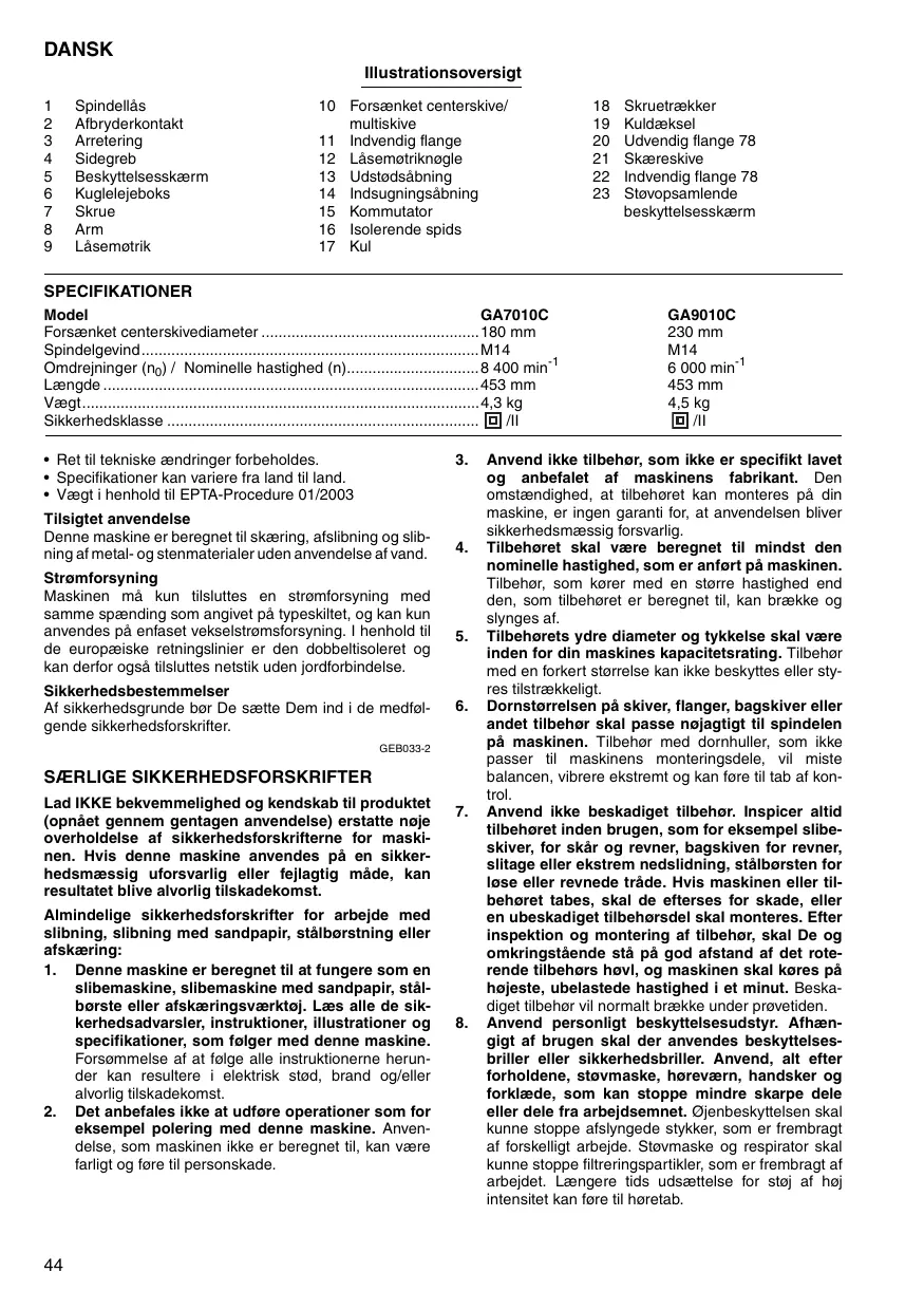 SPECIFIKATIONER Model GA7010C Forsænket centerskivediameter 180 mm Spindelgevind M14 Omdrejninger (n0) / Nominelle hastighed (n) 8 400 min-1 Længde 453 mm Vægt4,3 kg Sikkerhedsklasse /II • Ret til tekniske ændringer forbeholdes. • Specifikationer kan variere fra land til land. • Vægt i henhold til EPTA-Procedure 01/2003