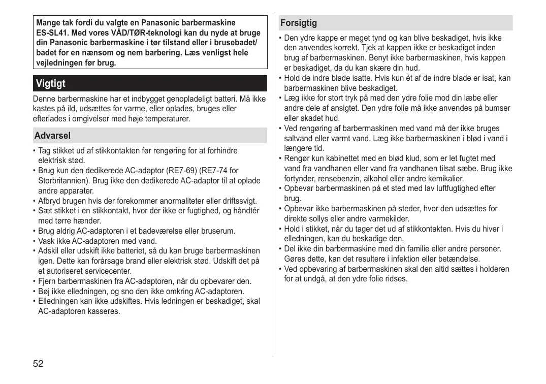 Advarsel • Tag stikket ud af stikkontakten før rengøring for at forhindre elektrisk stød. • Brug kun den dedikerede AC-adaptor (RE7‑69) (RE7‑74 for Storbritannien). Brug ikke den dedikerede AC-adaptor til at oplade andre apparater. • Afbryd brugen hvis der forekommer anormaliteter eller driftssvigt. • Sæt stikket i en stikkontakt, hvor der ikke er fugtighed, og håndtér med tørre hænder. • Brug aldrig AC-adaptoren i et badeværelse eller bruserum. • Vask ikke AC-adaptoren med vand. • Adskil eller udskift ikke batteriet, så du kan bruge barbermaskinen igen. Dette kan forårsage brand eller elektrisk stød. Udskift det på et autoriseret servicecenter. • Fjern barbermaskinen fra AC-adaptoren, når du opbevarer den. • Bøj ikke elledningen, og sno den ikke omkring AC-adaptoren. • Elledningen kan ikke udskiftes. Hvis ledningen er beskadiget, skal AC-adaptoren kasseres.