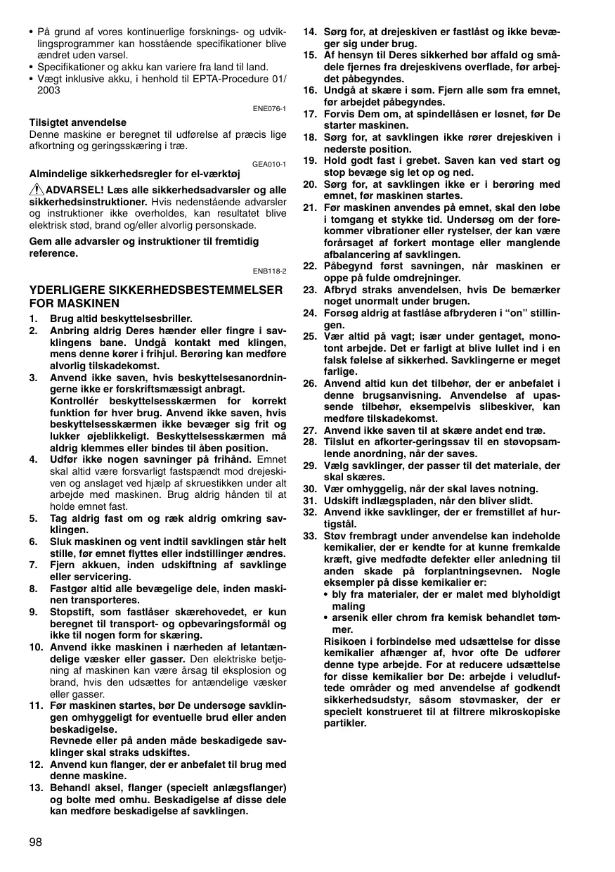 • le plomb que contient les matériaux recouverts de peinture à base de plomb ; • l’arsenic et le chrome que contient le bois de construction traité chimiquement. Les risques encourus varient suivant la fréquence d’exposition qu’implique votre travail. Pour réduire votre degré d’exposition à ces produits chimiques : travaillez dans une aire de travail bien aérée et en utilisant des dispositifs de sécurité approuvés, tels que des masques à poussière spécialement conçus pour filtrer les particules microscopiques. 34. Pour réduire le bruit émis par la lame, assurezvous toujours qu’elle est bien affûtée et propre. 35. L’utilisateur doit avoir reçu une formation adéquate concernant l’utilisation, le réglage et le fonctionnement de l’outil. 36. Utilisez des lames bien affûtées. Respectez la vitesse maximale indiquée sur la lame. 37. Évitez de retirer de la zone de coupe les coupures et autres bouts détachés de la pièce à couper pendant que l’outil tourne encore et que la tête de la lame n’est pas en position de repos. 38. Utilisez exclusivement les lames recommandées par le fabricant et conformes à la norme EN847-1. 39. Portez des gants pour manipuler la lame (les lames doivent être transportées dans un étui lorsque possible) et les pièces de matériau rude.