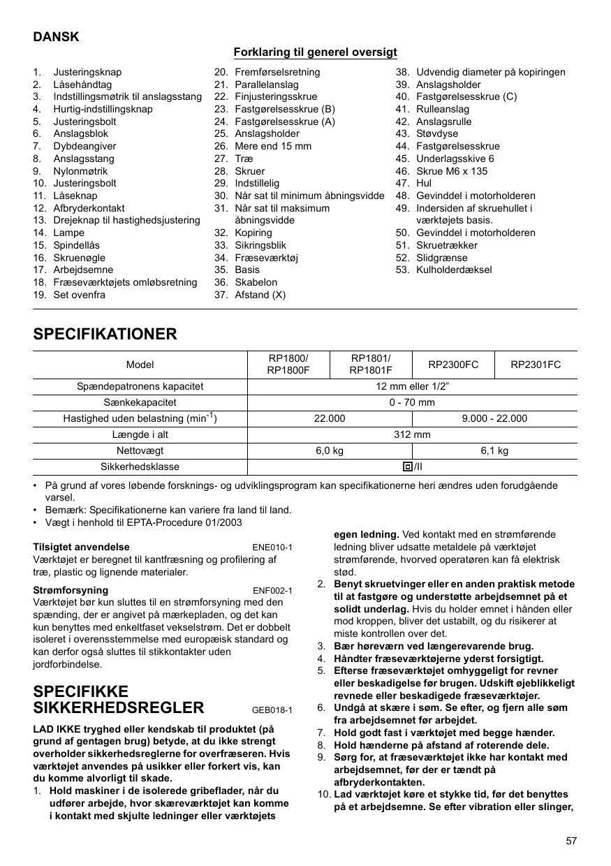 5. Perno de ajuste 25. Soporte de la guia 42. Rodillo guia 6. Bloque de tope 26. Més de 15 mm 43. Boquilla de polvo 7. Indicador de profundidad 27. Madera 44. Tomillo de apriete 8. Varilla de tope 28. Tornillos 45. Arandela plana 6 9. Tuerca de nylon 29. Môvil 46. Torillo M6 x 135 10. Perno de ajuste 30. Cuando se ajusta en el ancho de 47. Orificio 11. Botôn de bloqueo apertura minimo 48. Parte con rosca del soporte del 12. Interruptor disparador 31. Cuando se ajusta en el ancho de motor 13. Dial de regulaciôn de la velocidad apertura mäximo 49. Interior del orificio para el tomill 14. Lämpara 32. Guia para plantilla de la base de la herramienta 15. Bloqueo del eje 33. Placa de bloqueo 50. Parte con rosca del soporte del 16. Liave 34. Fresa motor 17. Pieza de trabajo 35. Base 51. Destornillador 18. Direcciôn de giro de la fresa 36. Plantila 52. Marca de limite 19. Vista desde la parte superior de la 37. Distancia (X) 53. Tapa del portaescobillas herramienta ESPECIFICACIONES RP1800/ RP1801/ Modelo RP 1800 RPABOIE RP2300FC RP2301FC Capacidad de boquilla 12 mm o 12° Capacidad de penetraciôn 0-70 mm Velocidad en vacio (min 1) 22.000 Ï 9.000 - 22.000 Observe si se producen vibraciones u oscilaciones, puesto que son sintomas de que la fresa no se ha instalado correctamente.