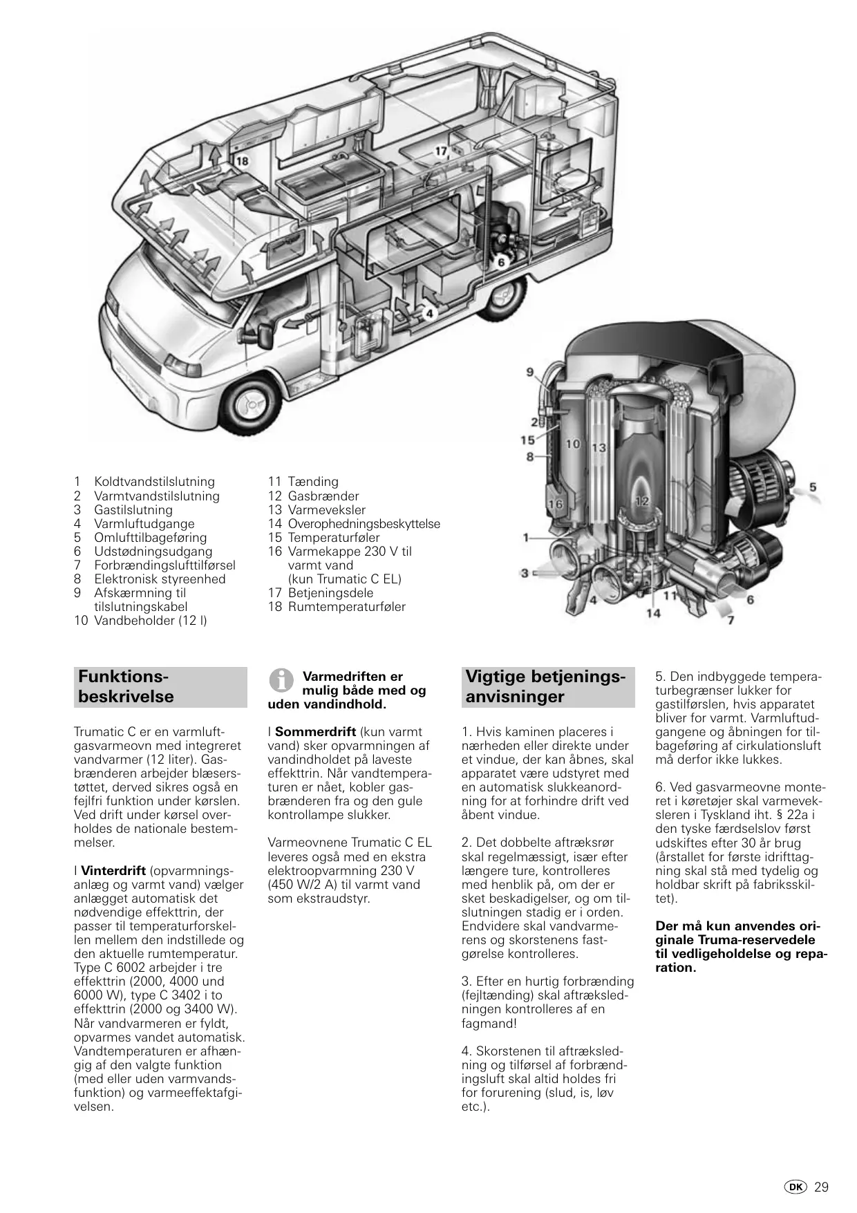 Koldtvandstilslutning Varmtvandstilslutning Gastilslutning Varmluftudgange Omlufttilbageføring Udstødningsudgang Forbrændingslufttilførsel Elektronisk styreenhed Afskærmning til tilslutningskabel 10 Vandbeholder (12 l) Funktionsbeskrivelse Trumatic C er en varmluftgasvarmeovn med integreret vandvarmer (12 liter). Gasbrænderen arbejder blæserstøttet, derved sikres også en fejlfri funktion under kørslen. Ved drift under kørsel overholdes de nationale bestemmelser. I Vinterdrift (opvarmningsanlæg og varmt vand) vælger anlægget automatisk det nødvendige effekttrin, der passer til temperaturforskellen mellem den indstillede og den aktuelle rumtemperatur. Type C 6002 arbejder i tre effekttrin (2000, 4000 und 6000 W), type C 3402 i to effekttrin (2000 og 3400 W). Når vandvarmeren er fyldt, opvarmes vandet automatisk. Vandtemperaturen er afhængig af den valgte funktion (med eller uden varmvandsfunktion) og varmeeffektafgivelsen.
