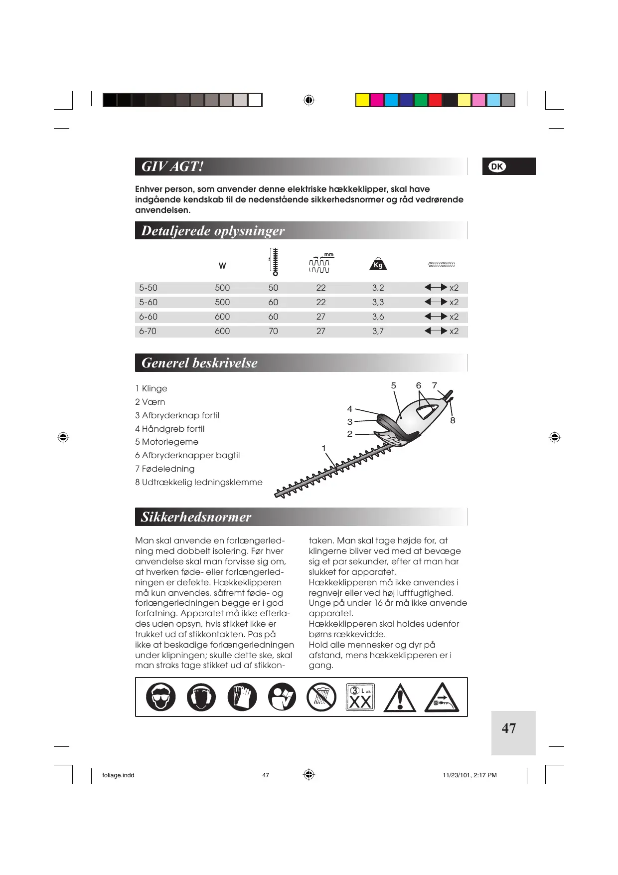 Enhver person, som anvenderijke elektriske hækkeklipper, skal have indgående kendskab til de nedenstående sikkerhedsnormer og råd vedrørende anvendelsen.