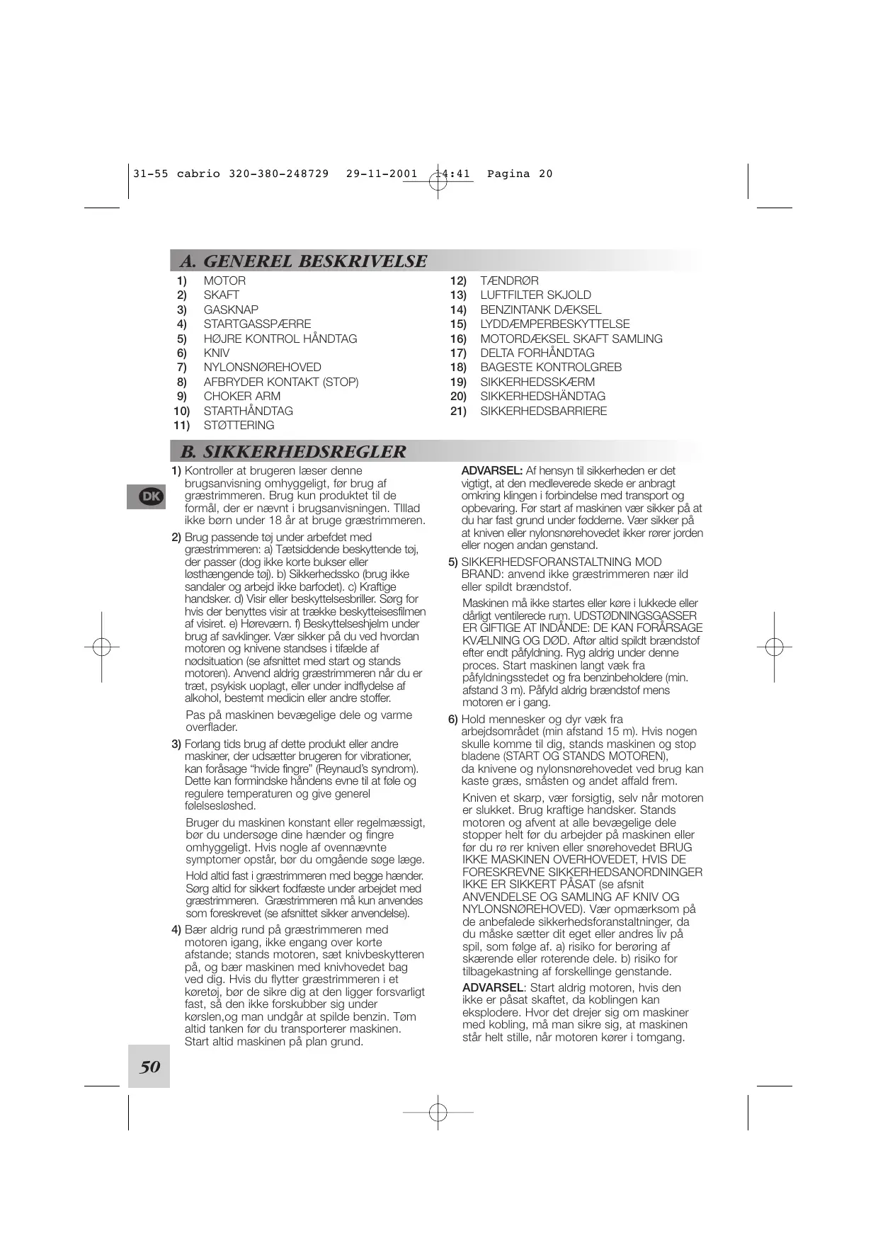 motoren igang, kke engang over korte afstande: stands motoren, sæt knivbeskytteren pä, og bær maskinen med knivhovedet bag ved dig. Hvis du flytter græstrimmeren i et koreto, bar de sikre dig at den ligger forsvarligt fast, sÀ den ikke forskubber sig under kersien,og man undgär at spilde benzin. Tem altid tanken for du transporterer maskinen. Start altid maskinen pà plan grund. 31-55 cabrio 320-380-248729 29-11-2001 : 41 Pagina 20