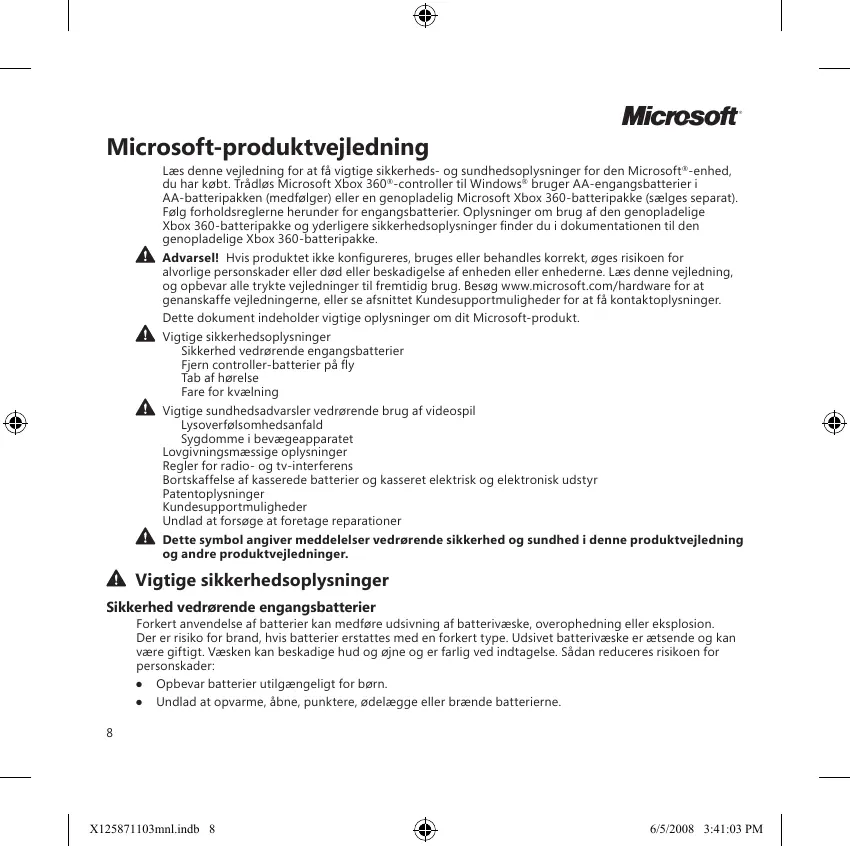 Microsoft-produktvejledning Læs denne vejledning for at fà vigtige sikkerheds- og sundhedsoplysninger for den Microsoft"-enhed, du har kabt. frädlas Microsoft Xbox 360°-controller til Windows: bruger AA-engangsbatterier i AA-batteripakken (medfalger) eller en genopladelig Microsoft Xbox 360-batteripakke (sælges separat) Falg forholdsreglerne herunder for engangsbatterier. Oplysninger om brug af den genopladelige Xbox 360-batteripakke og yderligere sikkerhedsoplysninger finder du i dokumentationen til den genopladelige Xbox 360-batteripakke À ndvarsell His produktet ikke konfigureres, bruges eller behandles korrekt, ages rsikoen for alvorlige personskeder eller dad eller beskadigelse af enheden eller enhederne. Læs denne vejledning og opbevar alle trykte vejledninger til fremtidig brug. Besag wwwmicrosoft.com/hardware for at genanskaffe vejledningerne, eller se afsnittet Kundesupportmuligheder for at à kontaktoplysninger Dette dokument indeholder vigtige oplysninger om dit Microsoft-produkt À vigrice sikkerhedsoplysninger Sikkerhed vedrarende engangsbatterier Fjern contrller-batterier pé fly Tab af horelse Fare for kvælning À vigtige sundhedsadvarster vedrarende brug af videospil Lysoverfalsomhedsanfald Sygdomme i bevægeapparatet Lovgivningsmæssige oplysninger Reger for radio- og tv-interferens Bortskaffelse af kasserede batterier og kasseret elektrisk og elektronisk udstyr Patentoplysninger Kundesupportmuligheder Undiad at forsage at foretage reparationer Dette symbol angiver meddelelser vedrarende sikkerhed og sundhed i denne produktvejledning og andre produktvejledning À Vigtige sikkerhedsoplysninger Sikkerhed vedrarende engangsbatterier Forkert anvendelse af batterier kan medfare udsivning af batterivæske, overophedning eller eksplosion. Der er rsiko for brand, hvis batterier erstattes med en forkert type. Udsivet batterivæske er ætsende 09 kan være giftigt. Væsken kan beskadige hud og ajne og er farlig ved indtagelse. Sädan reduceres risikoen for personskader + Opbevar batterier utilgængeligt for barn. + Undlad at opvarme, äbne, punktere, sdelægge eller brænde batterierne. xs Gama & & sam sarl