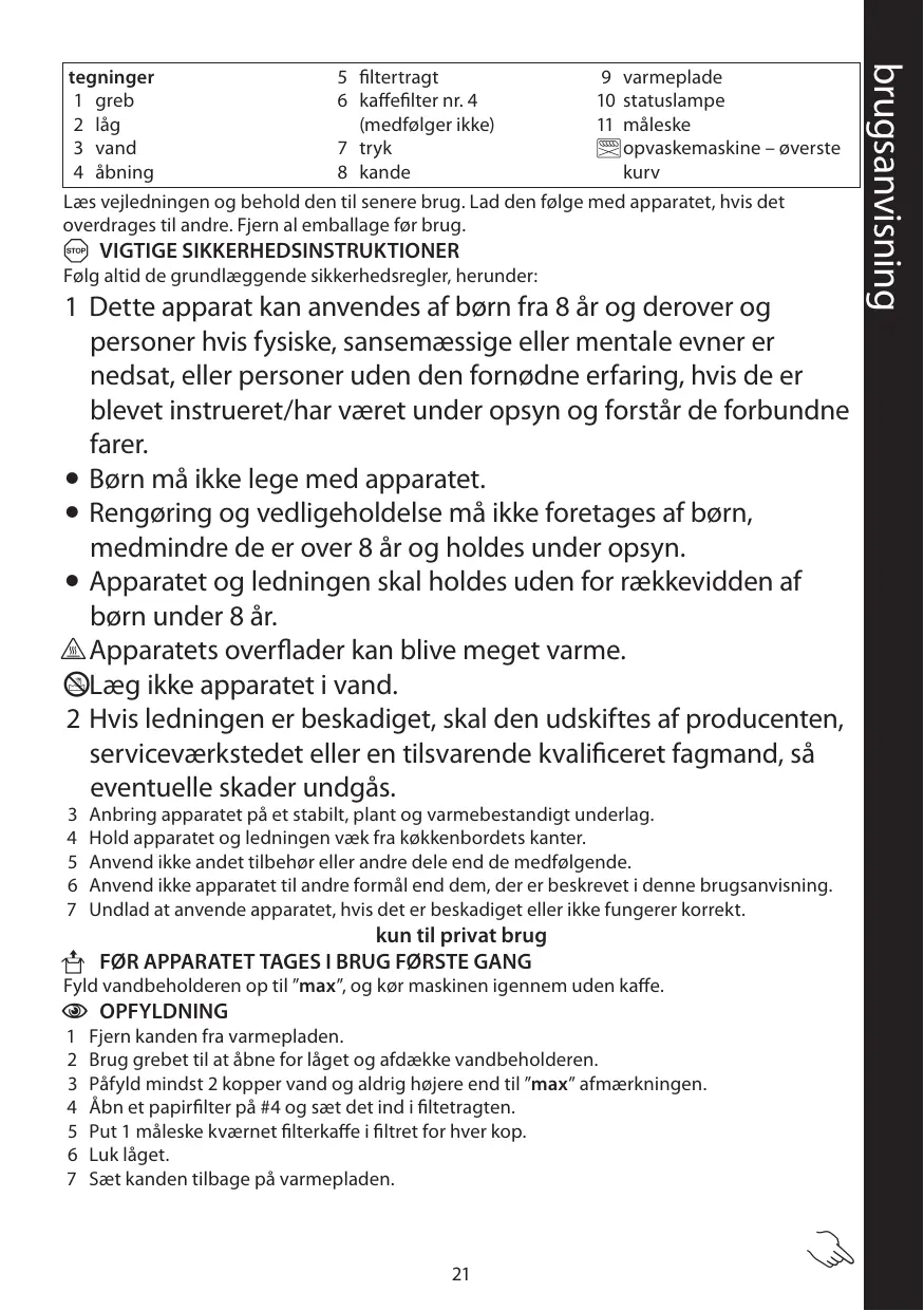 tegninger 5 filtertragt 9 varmeplade 1 greb 6 kaffefilter nr. 4 10 statuslampe 2 låg (medfølger ikke) 11 måleske 3 vand 7 tryk ¬ opvaskemaskine – øverste 4 åbning 8 kande kurv Læs vejledningen og behold den til senere brug. Lad den følge med apparatet, hvis det overdrages til andre. Fjern al emballage før brug.