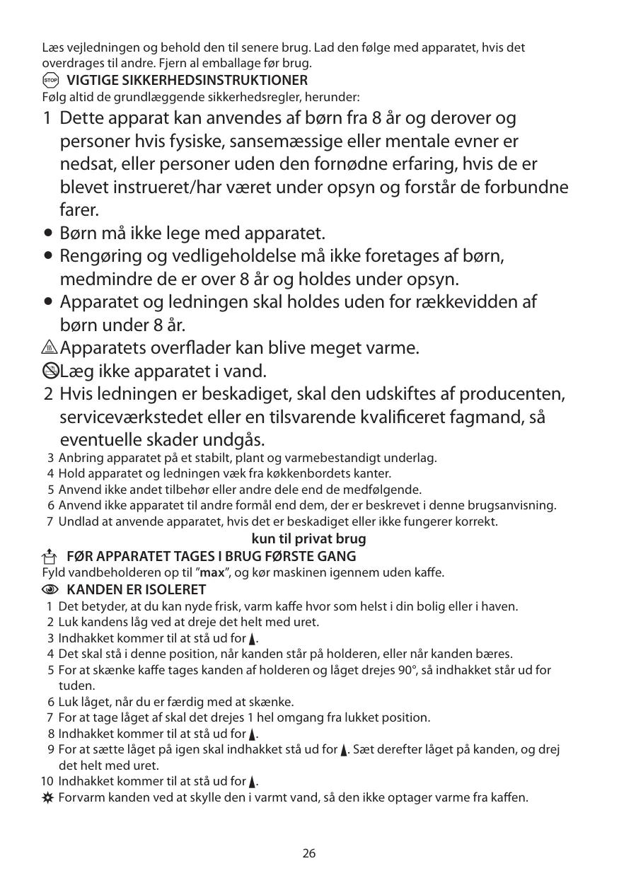 1 Dette apparat kan anvendes af børn fra 8 år og derover og personer hvis fysiske, sansemæssige eller mentale evner er nedsat, eller personer uden den fornødne erfaring, hvis de er blevet instrueret/har været under opsyn og forstår de forbundne farer. • Børn må ikke lege med apparatet. • Rengøring og vedligeholdelse må ikke foretages af børn, medmindre de er over 8 år og holdes under opsyn. • Apparatet og ledningen skal holdes uden for rækkevidden af børn under 8 år. h Apparatets overflader kan blive meget varme. lLæg ikke apparatet i vand. 2 Hvis ledningen er beskadiget, skal den udskiftes af producenten, serviceværkstedet eller en tilsvarende kvalificeret fagmand, så eventuelle skader undgås. 3 Anbring apparatet på et stabilt, plant og varmebestandigt underlag. 4 Hold apparatet og ledningen væk fra køkkenbordets kanter. 5 Anvend ikke andet tilbehør eller andre dele end de medfølgende. 6 Anvend ikke apparatet til andre formål end dem, der er beskrevet i denne brugsanvisning. 7 Undlad at anvende apparatet, hvis det er beskadiget eller ikke fungerer korrekt.