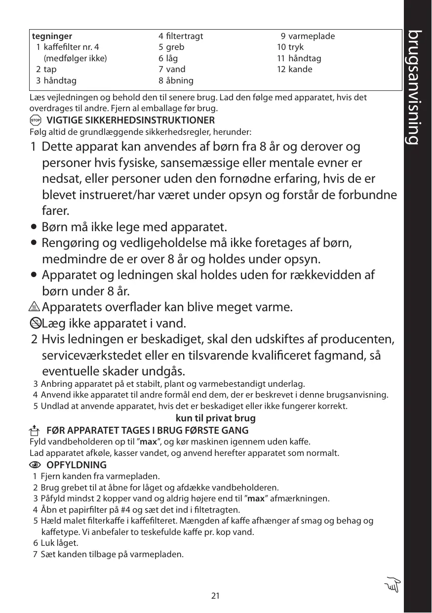 - Apparatet og ledningen skal holdes uden for rækkevidden af børn under 8 år. h Apparatets overflader kan blive meget varme. lLæg ikke apparatet i vand. 2 Hvis ledningen er beskadiget, skal den udskiftes af producenten, serviceværkstedet eller en tilsvarende kvalificeret fagmand, så eventuelle skader undgås. 3 Anbring apparatet på et stabilt, plant og varmebestandigt underlag. 4 Anvend ikke apparatet til andre formål end dem, der er beskrevet i denne brugsanvisning. 5 Undlad at anvende apparatet, hvis det er beskadiget eller ikke fungerer korrekt. kun til privat brug U FØR APPARATET TAGES I BRUG FØRSTE GANG Fyld vandbeholderen op til ”max”, og kør maskinen igennem uden kaffe. Lad apparatet afkøle, kasser vandet, og anvend herefter apparatet som normalt. C OPFYLDNING 1 Fjern kanden fra varmepladen. 2 Brug grebet til at åbne for låget og afdække vandbeholderen. 3 Påfyld mindst 2 kopper vand og aldrig højere end til ”max” afmærkningen. 4 Åbn et papirfilter på #4 og sæt det ind i filtetragten. 5 Hæld malet filterkaffe i kaffefilteret. Mængden af kaffe afhænger af smag og behag og kaffetype. Vi anbefaler to teskefulde kaffe pr. kop vand. 6 Luk låget. 7 Sæt kanden tilbage på varmepladen.