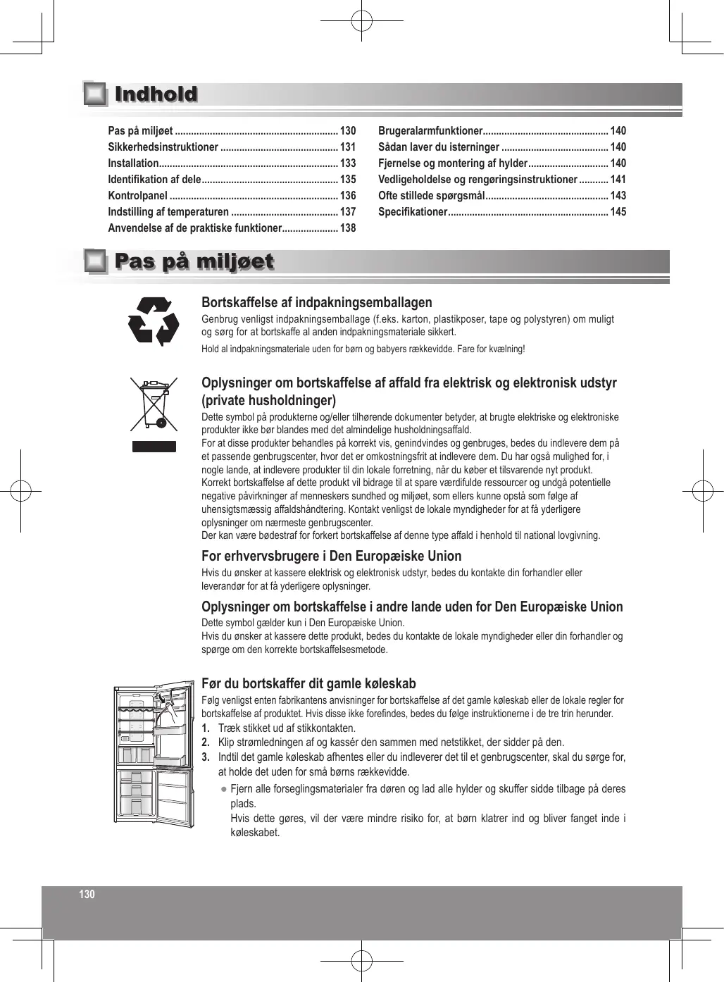 Indhold Pas på miljøet 130 Sikkerhedsinstruktioner 131 Installation 133 Identifikation af dele 135 Kontrolpanel 136 Indstilling af temperaturen 137 Anvendelse af de praktiske funktioner 138