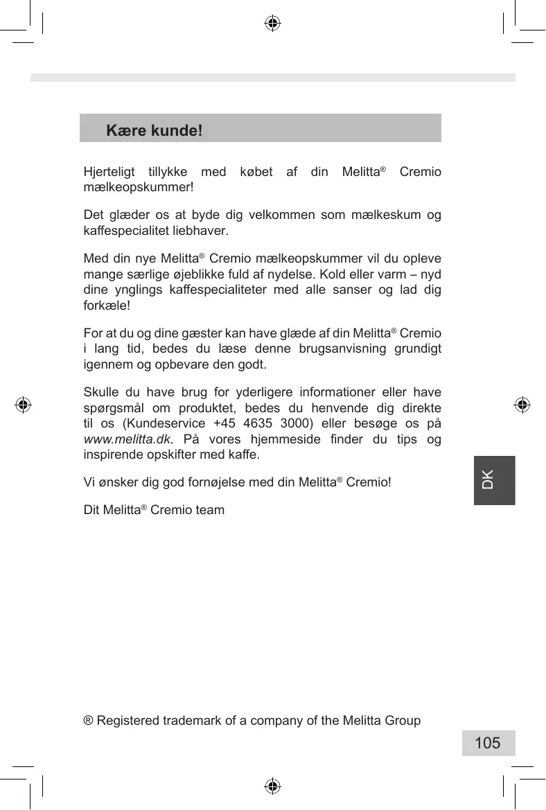 DK Skulle du have brug for yderligere informationer eller have spørgsmål om produktet, bedes du henvende dig direkte til os (Kundeservice +45 4635 3000) eller besøge os på www.melitta.dk. På vores hjemmeside finder du tips og inspirende opskifter med kaffe.