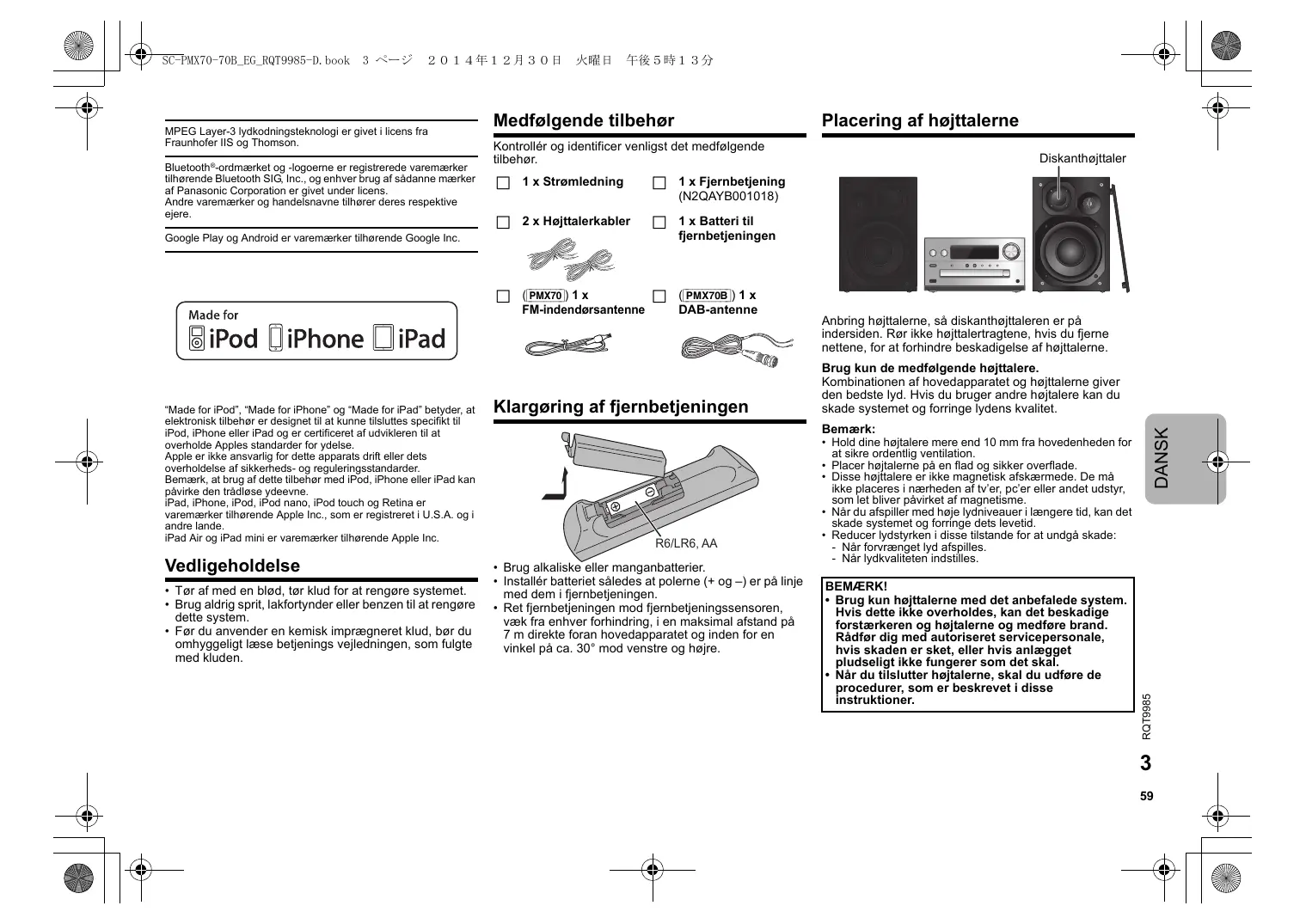 - Når du tilslutter højtalerne, skal du udføre de procedurer, som er beskrevet i disse instruktioner. DANSK 3 ページ RQT9985 SC-PMX70-70B_EG_RQT9985-D.book