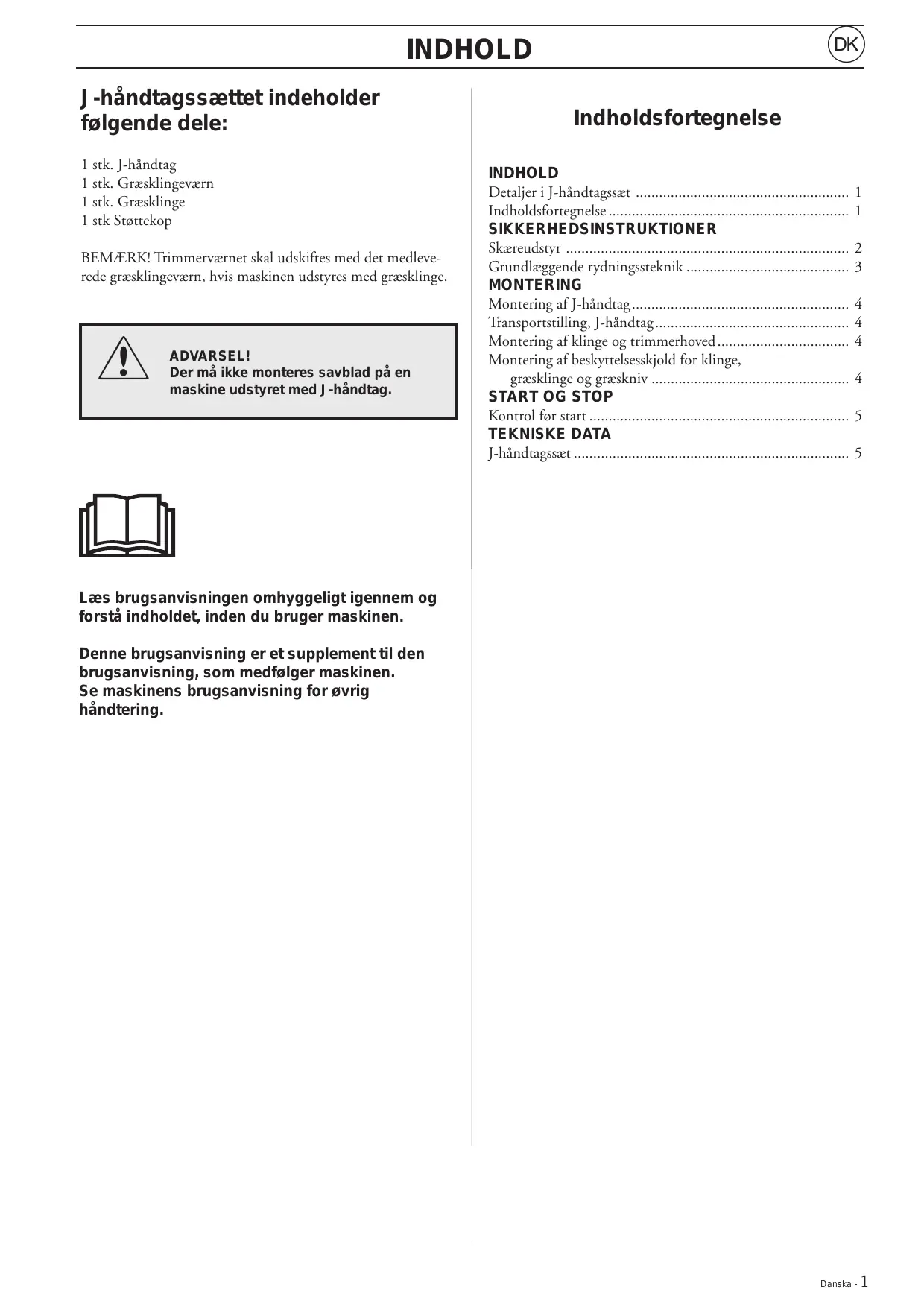 Montaje de la protección de hoja, hoja y cuchilla de hierba .. ARRANQUE Y DETENCIÓN Control antes de arrancar DATOS TÉCNICOS Juego de mangos J