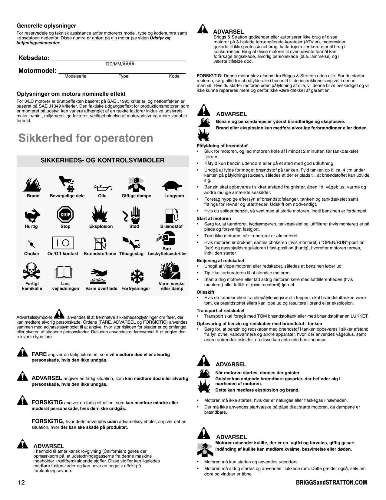 Generelle oplysninger ADVARSEL For reservedele og teknisk assistance anfør motorens model, type og kodenumre samt købsdatoen nedenfor. Disse numre er anført på din motor (se siden Udstyr og betjeningselementer. Købsdato: Briggs & Stratton godkender eller autoriserer ikke brug af disse motorer på 3-hjulede terrængående køretøjer (ATV’er), motorcykler, gokarts til ikke-professionel brug, luftfartøjer eller køretøjer til brug i konkurrencer. Brug af disse motorer til ovennævnte formål kan forårsage tingsskade, alvorlig personskade (bl.a. lammelse) og i værste tilfælde død. DD/MM/ÅÅÅÅ Motormodel: Modelserie: Type: Kode: Oplysninger om motors nominelle effekt FORSIGTIG: Denne motor blev afsendt fra Briggs & Stratton uden olie. Før du starter motoren, sørg altid for at påfylde olie i henhold til de instruktioner angivet i denne manual. Hvis du starter motoren uden påfyldning af olie, vil denne blive beskadiget og vil ikke kunne repareres mere og derfor ikke være dækket af garantien. For 3/LC motorer er bruttoeffekten baseret på SAE J1995 kriterier, og nettoeffekten er baseret på SAE J1349 kriterier. Den faktiske udgangseffekt for produktionsmotorer, som er monteret på udstyr, kan variere afhængigt af en række faktorer inklusive udstyrets maks. o/min., miljømæssige faktorer, vedligeholdelse af motor/udstyr og andre variable forhold. Sikkerhed for operatoren