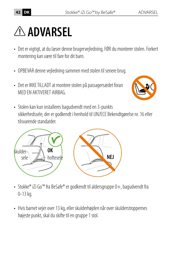 • Stokke® iZi Go™ fra BeSafe® er godkendt til aldersgruppe 0+, bagudvendt fra 0-13 kg. • Hvis barnet vejer over 13 kg, eller skulderhøjden når over skulderstroppernes højeste punkt, skal du skifte til en gruppe 1 stol.