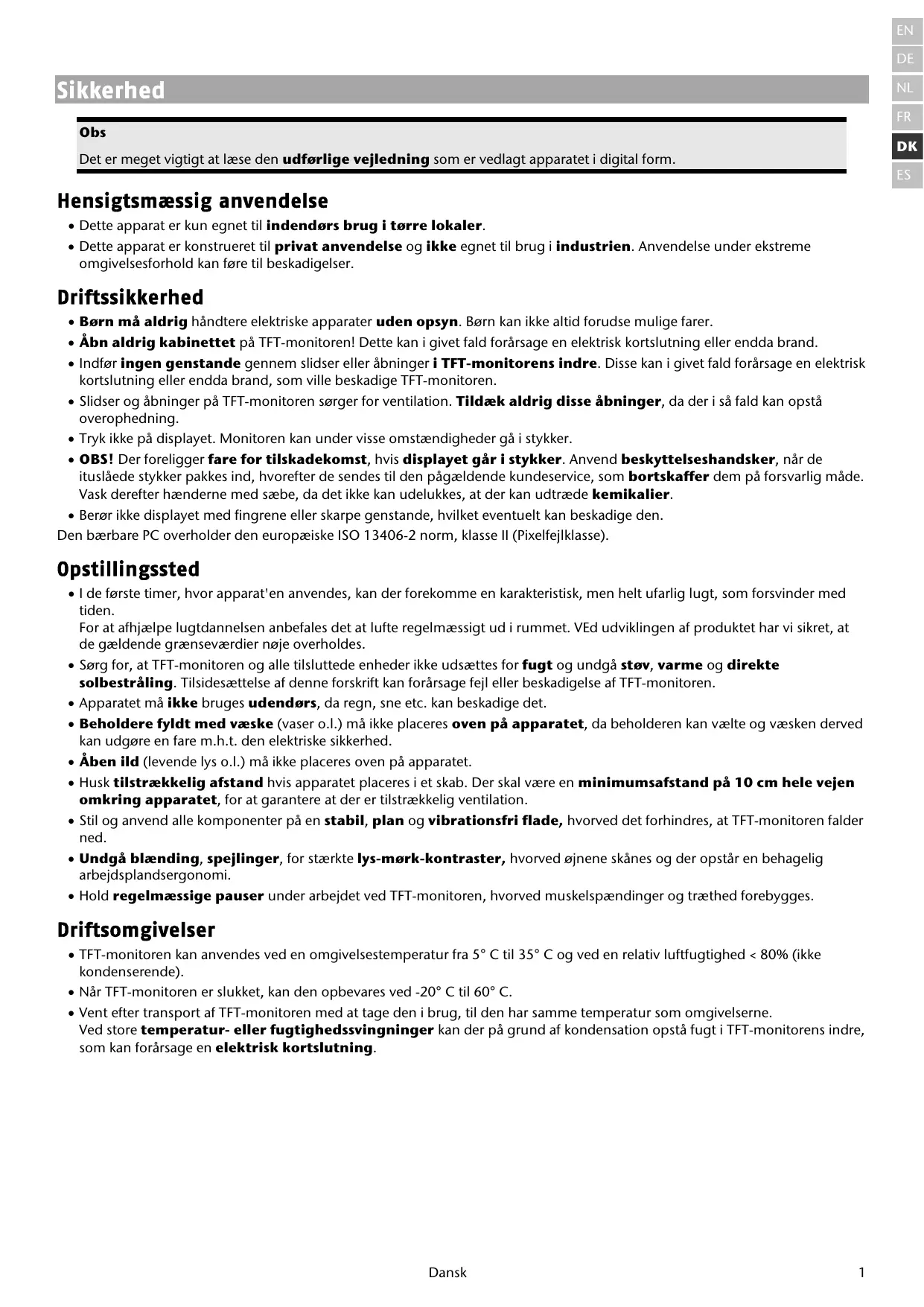 - TFT-monitoren kan anvendes ved en omgivelsestemperatur fra 5° C til 35° C og ved en relativ luftfugtighed < 80% (ikke kondenserende).