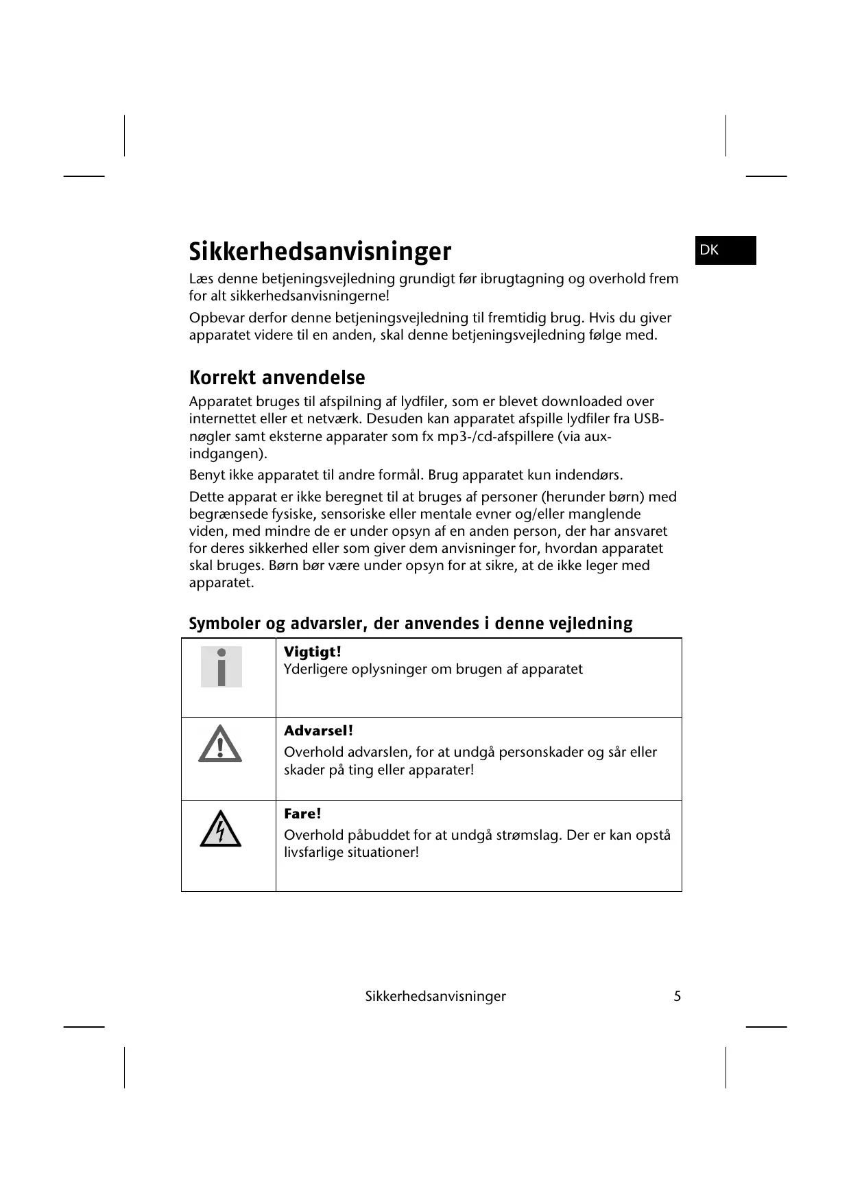 Apparatet bruges til afspilning af lydfiler, som er blevet downloaded over internettet eller et netværk. Desuden kan apparatet afspille lydfiler fra USB- nggler samt eksterne apparater som fx mp3-/cd-afspillere (via aux- indgangen).