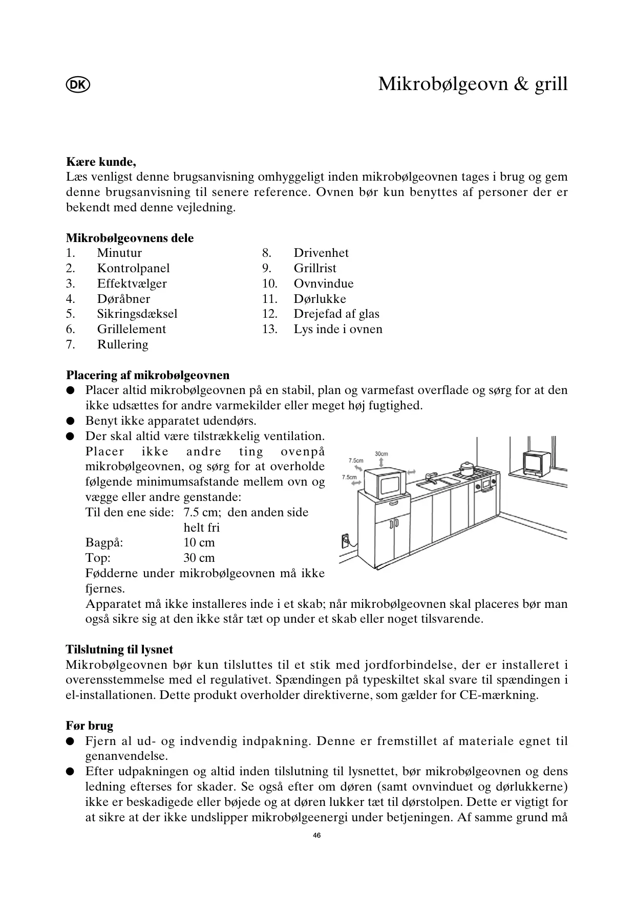 Drivenhet Grillrist Ovnvindue Dørlukke Drejefad af glas Lys inde i ovnen Placering af mikrobølgeovnen ● Placer altid mikrobølgeovnen på en stabil, plan og varmefast overflade og sørg for at den ikke udsættes for andre varmekilder eller meget høj fugtighed. ● Benyt ikke apparatet udendørs. ● Der skal altid være tilstrækkelig ventilation. Placer ikke andre ting ovenpå mikrobølgeovnen, og sørg for at overholde følgende minimumsafstande mellem ovn og vægge eller andre genstande: Til den ene side: 7.5 cm; den anden side helt fri Bagpå: 10 cm Top: 30 cm Fødderne under mikrobølgeovnen må ikke fjernes. Apparatet må ikke installeres inde i et skab; når mikrobølgeovnen skal placeres bør man også sikre sig at den ikke står tæt op under et skab eller noget tilsvarende. Tilslutning til lysnet Mikrobølgeovnen bør kun tilsluttes til et stik med jordforbindelse, der er installeret i overensstemmelse med el regulativet. Spændingen på typeskiltet skal svare til spændingen i el-installationen. Dette produkt overholder direktiverne, som gælder for CE-mærkning. Før brug ● Fjern al ud- og indvendig indpakning. Denne er fremstillet af materiale egnet til genanvendelse. ● Efter udpakningen og altid inden tilslutning til lysnettet, bør mikrobølgeovnen og dens ledning efterses for skader. Se også efter om døren (samt ovnvinduet og dørlukkerne) ikke er beskadigede eller bøjede og at døren lukker tæt til dørstolpen. Dette er vigtigt for at sikre at der ikke undslipper mikrobølgeenergi under betjeningen. Af samme grund må