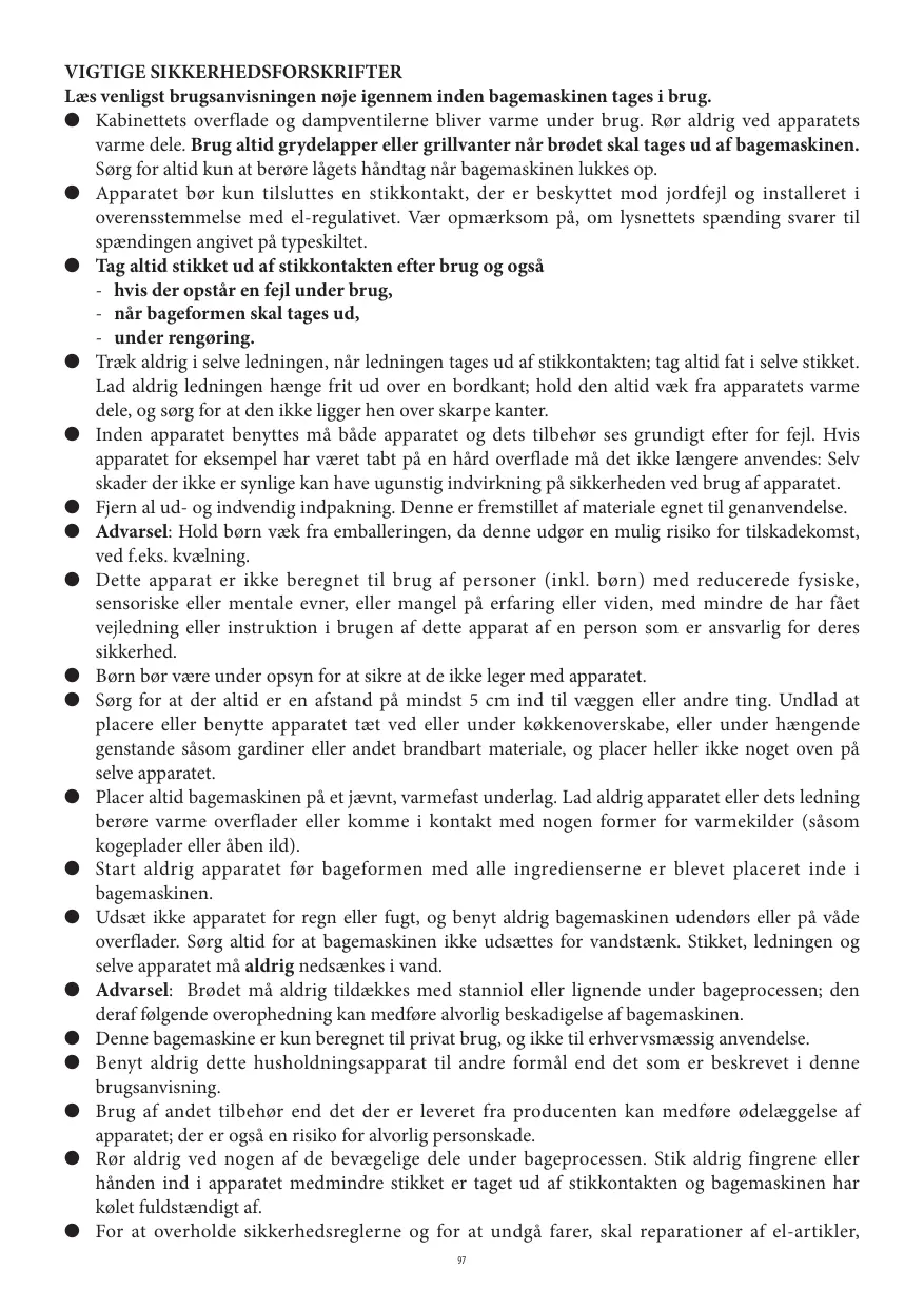 Ror aldrig ved nogen af de bevagelige dele under bageprocessen. Stik aldrig fingrene ell handen ind i apparatet medmindre stikket er taget ud af stikkontakten og bagemaskinen har klet fuldstendigt af.