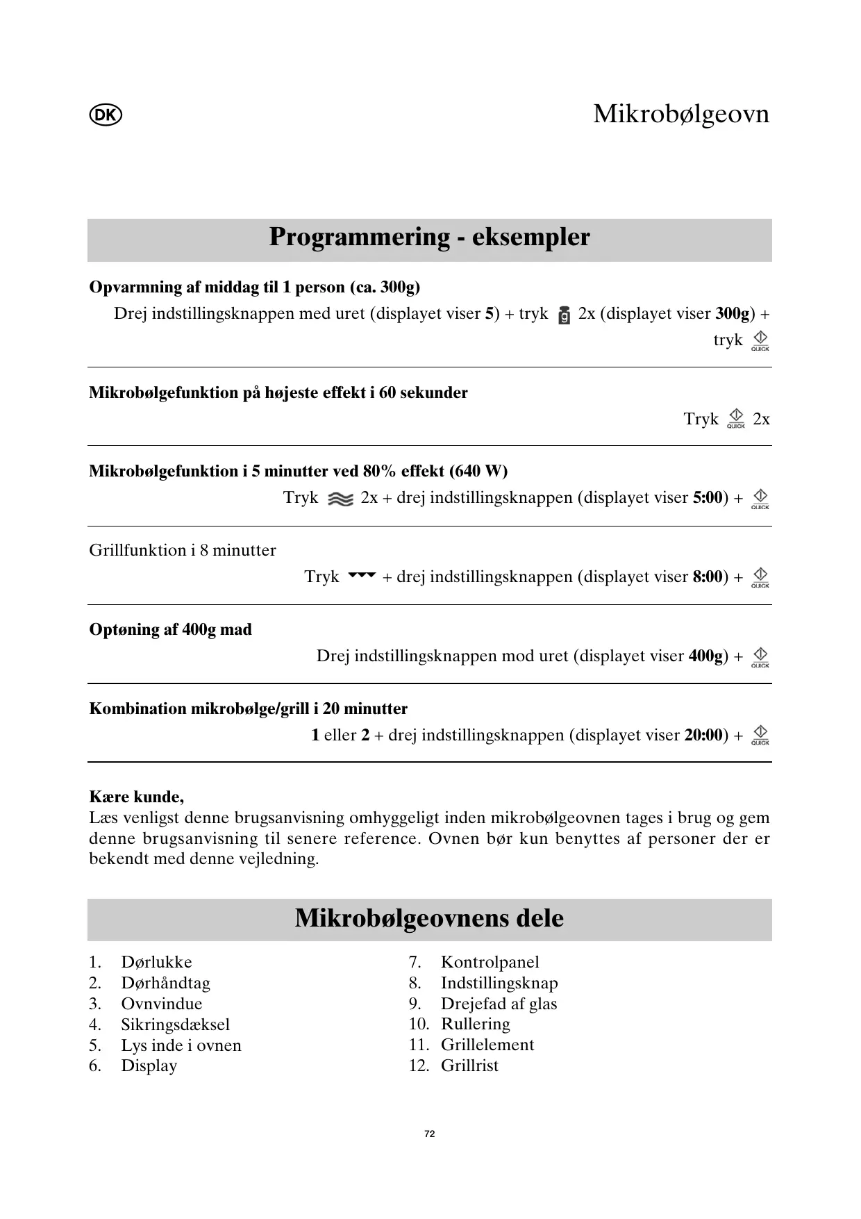 Informations générales concernant la programmation de l'appareil Pour un fonctionnement optimal, ce four à micro-ondes utilise des composants électroniques de dernière génération. - A chaque pression sur une touche de commande, la validation de la commande est accompagnée d'un seul bip sonore. - Si un programme est prêt à être validé, le symbole s'affiche en clignotant. - Pendant le déroulement d'un programme, les détails de la programmation peuvent être affichés en appuyant sur la touche concernée. Par exemple, en appuyant sur la touche pendant un programme de cuisson aux micro-ondes, l'écran affiche la puissance programmée. - La programmation peut être interrompue ou redémarrée en appuyant sur la touche . Fonctionnement général - Placez les aliments destinés à être chauffés dans un récipient approprié. Posez le récipient sur le plateau tournant du four. - Lors de l'utilisation de la fonction micro-ondes, les aliments doivent être couverts pour éviter leur dessèchement. Des couvercles en verre ou en plastique spécialement conçus pour une utilisation dans les appareils à micro-ondes sont disponibles dans le commerce. - Abstenez-vous, lors de l'utilisation de la fonction combinée four à micro-ondes/gril, de couvrir les aliments destinés à la cuisson. Posez la grille fournie avec l'appareil à même le plateau tournant en verre et placez les aliments sur la grille. - Fermez la porte, puis sélectionnez le programme désiré. - Lorsque le programme démarre, le plateau commence à tourner. Pendant le fonctionnement, l'éclairage intérieur reste allumé. - Si un programme n'est pas démarré dans les 30 secondes, l'appareil revient automatiquement au mode « Stand-by ». - Si, pendant le fonctionnement, la touche est pressée ou la porte est ouverte (par exemple, pour remuer les aliments afin d'assurer une bonne répartition de la température), l'appareil s'arrête et les fonctions de minuterie et de programmation sont suspendues. Pour reprendre le programme, refermez la porte et appuyez sur la touche . - Appuyez deux fois sur la touche pour interrompre le programme. - 4 bips sonores indiquent la fin du temps pré-programmé ; l'éclairage intérieur s'éteint. L'écran affiche END. Le signal sonore est répété à intervalles de 2 minutes jusqu'à l'ouverture de la porte ou une pression sur la touche . - Ouvrez la porte et retirez le récipient contenant les aliments. - Laissez le récipient de côté pendant plusieurs minutes afin d'assurer une distribution uniforme de la chaleur dans les aliments. - Le temps de cuisson dépend en général de plusieurs facteurs. - Les micro-ondes pénètrent la surface des aliments. Donc, pour les aliments en grandes portions, le temps de cuisson nécessaire sera plus long que pour des aliments en petits morceaux. De plus, les aliments doivent être uniformément répartis sur le plat. - Pour assurer la destruction de toute bactérie contenue dans les aliments, il est nécessaire d'exposer les aliments à des températures élevées pendant une durée 31