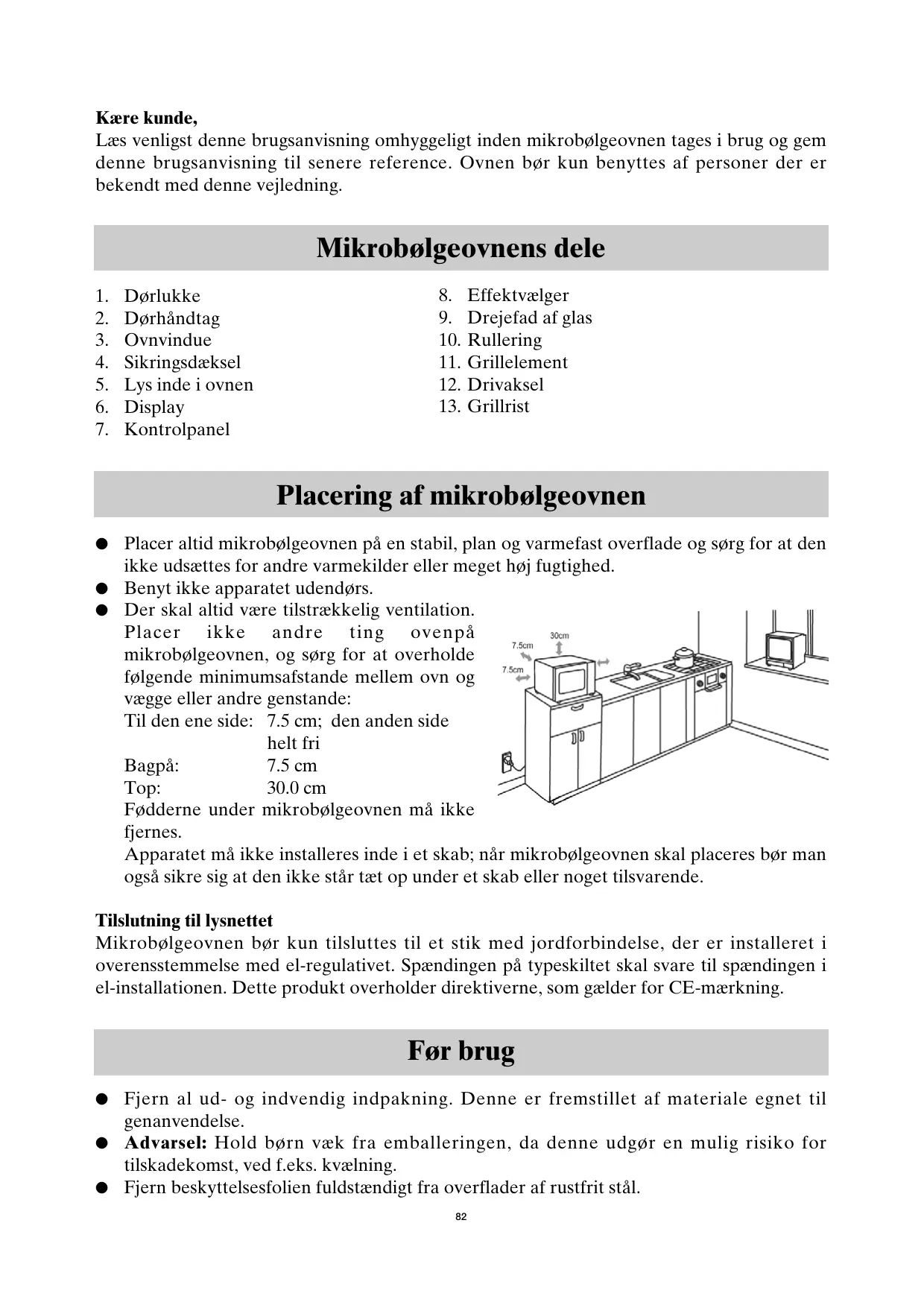 Un côté : 7.5 cm; sans obstruction de l'autre côté A l'arrière: 7.5 cm Au-dessus: 30.0 cm Les pieds de l’appareil ne doivent pas être enlevés. L’appareil ne doit pas être encastré dans un placard de cuisine. Évitez également de positionner l’appareil immédiatement dessous un élément ou autre objet analogue. Branchement au secteur L’appareil doit être branché exclusivement sur une prise de courant avec terre, installée selon les normes en vigueur. Assurez-vous que la tension d’alimentation correspond à la tension indiquée sur la plaque signalétique de l’appareil. Ce produit est conforme aux directives obligatoires inhérentes au marquage CE.