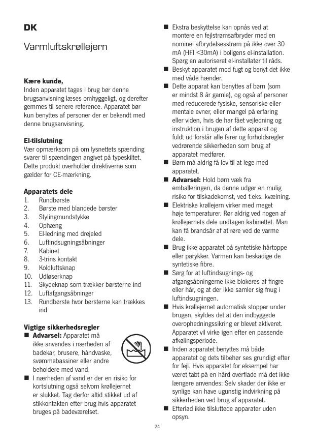 ind Vigtige sikkerhedsregler Advarsel: Apparatet mà ikke anvendes i nærheden af badekar, brusere, händvaske, svemmebassiner eller andre beholdere med vand. 1 nærheden af vand er der en risiko for kortslutning ogsà selvom krallejernet er slukket. Tag derfor altid stldket ud af stikkontakten efter brug huis apparatet bruges pà badeuærelset M Ekctra beshytielse kan opnäs ved at montere en fejlstramsafbryder med en nominel afbrydelsesstram pà ikke over 30 mA (HFI <30mA] i boligens eHinstallation. Sparg en autoriseret einstallatar il râds. Beskyt apparatet mod fugt og benyt det ikke med väde hænder. Dette apparat kan benyttes af brn (sam er mindst 8 är gamle), og ogsà af personer med reducerede fysiske, sensoriske eller mentale evner, eller mangel pà erfaring ellr viden, hvis de har féet vejledning og instruktion i brugen af dette apparat og fuldt ud forstär all farer og forholdsregier vedrarende sikkerheden som brug af apparatet medforer. Born mà aldrig fà lov ti at lege med apparatet. ‘Advarsel: Hold bern veæk fra emballeringen, da denne udgor en mulig risiko for tilskadekomst, ved f.eks. kvælning. Elektriske krallejern virker med meget hoie temperaturer. Rer aldrig ved nogen af krallejernets dele undtagen kabinettet. Man kan fà brandsär af at rore ved de varme dele. Brug ikke apparatet p syntetiske hértoppe elle parykker. Varmen kan beskadige de syntetiske fibre. Srg for at lufindsugnings- og afgangsäbningemne ikke blokeres af fingre eller här, og at der ikke samler sig fnug i luftindsugningen. Huis krallejernet automatisk stapper under brugen, skyldes det at den indbyggede owerophedningssikring er bleuet aktiveret. Apparatet vi irke igen efter en passende afkolingsperiode. Inden apparatet benyttes mà bâde apparatet og des tilbehar ses grundigt efter for fe. Hvis apparatet for eksempel har veæret tabt pà en härd overflade mâ det ikke Iængere anvendes: Seiv skader der ikke er synlige kan have ugunstig induirkning pâ Sikkerheden ved brug af apparatet. Efterlad ikke tisluttede apparater uden opsyn.
