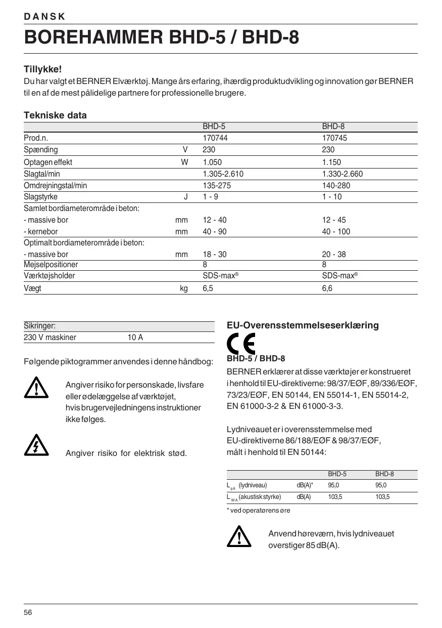 BHD-5 / BHD-8 BERNER erklærer at disse værktøjer er konstrueret i henhold til EU-direktiverne: 98/37/EØF, 89/336/EØF, 73/23/EØF, EN 50144, EN 55014-1, EN 55014-2, EN 61000-3-2 & EN 61000-3-3. Lydniveauet er i overensstemmelse med EU-direktiverne 86/188/EØF & 98/37/EØF, målt i henhold til EN 50144: BHD-5