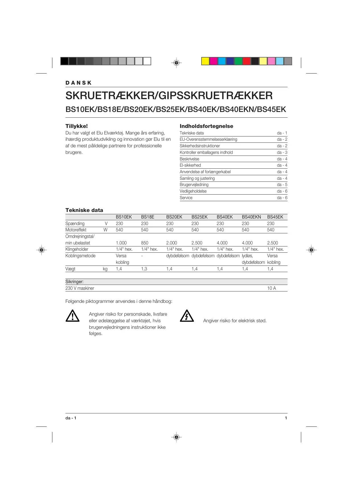 Samling og justering Træk stikket ud af stikkontakten inden samling og justering. Udskiftning af 1/4" hexagonalt tilbehør Din Elu skruetrækker har et 1/4" hexagonalt drevsystem. Drevtilbehøret holdes på plads i spindelen med en kugle og en fjeder, der går ind i en rille i tilbehørets skaft. BS20EK/BS25EK/BS40EK/BS40EKN (fig. B) • Tag ringen af (4) ved at trække den fremad. • Vælg det ønskede tilbehør (begge modeller) og den passende dybdemåler (5) når der bruges en møtrikspænder (BS20EK/BS25EK). • Tilbehøret (f.eks. en borholder eller møtrikspænder) (7) sættes på ved at skubbe det ind i holderen (8) indtil det klikker på plads. Hvis det er nødvendigt kan man banke letpå det. • Tilbehøret fjernes ved at det trækkes ud af holderen ved hjælp af en tang. • Sæt ringen (4) tilbage på plads ved at afpasse ribberne (9) indvendigt i ringen (4) med rillerne (10) i koblingshuset og trykke ringen på plads. BS10EK/BS45EK (fig. A) • Træk kugleholderen (5) frem og hold den fast. • Sæt tilbehøret i. • Slip kugleholderen. Udskiftning af klingebitsen (fig. A & B) • Træk simpelthen bitsen (11) ud. Det kan være nødvendigt at bruge en tang. BS20EK/BS25EK/BS40EK/BS40EKN Indstilling af skruedybden (fig. C) Dybdemåleren har følgende fordele: - den valgte skruedybde kan gentages, hvorved der opnås et jævnt resultat. - skruer med tætningsskiver spændes korrekt, så der ikke opstår lækager. Skruedybden bestemmes af dybdemålerens (5) position i forhold til bitsen eller patronen. Symbolerne på ringen indikerer, hvordan skruedybden skal indstilles. • Drej ringen med uret for at øge skruedybden. • Drej ringen mod uret for at mindske skruedybden. da - 4