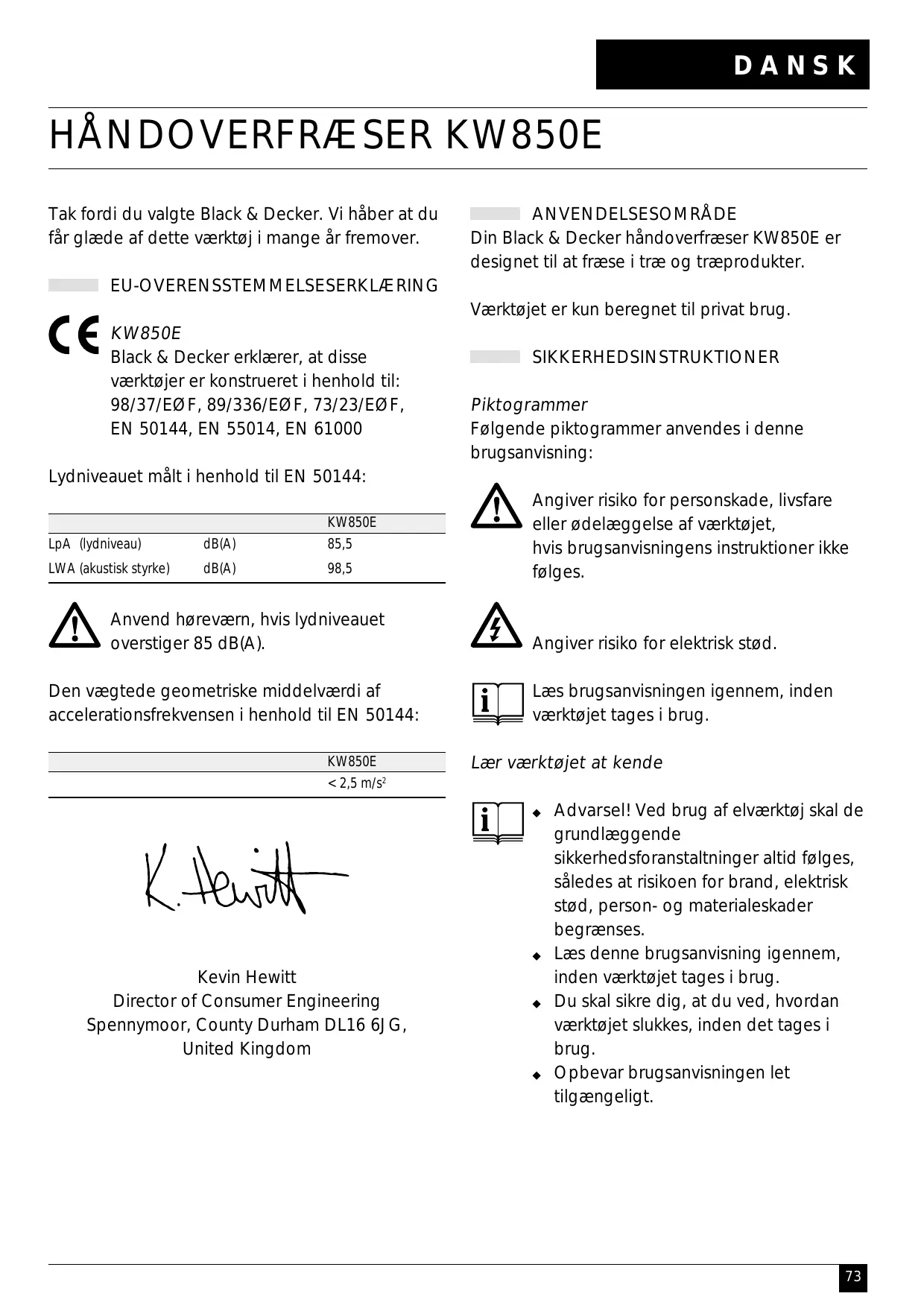 KW850E Black & Decker erklærer, at disse værktøjer er konstrueret i henhold til: 98/37/EØF, 89/336/EØF, 73/23/EØF, EN 50144, EN 55014, EN 61000
