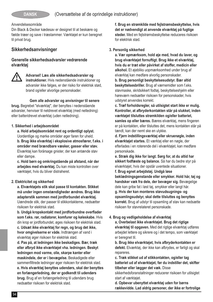 DANSK (Oversættelse af de oprindelige instruktioner) Anvendelsesområde Din Black & Decker kædesav er designet til at beskære og fælde træer og save i træstammer. Værktøjet er kun beregnet til privat brug. Sikkerhedsanvisninger Generelle sikkerhedsadvarsler vedrørende elværktøj