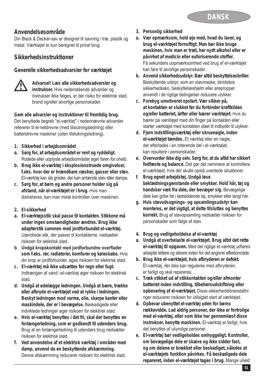 DANSK Anvendelsesområde Din Black & Decker-sav er designet til savning i træ, plastik og metal. Værktøjet er kun beregnet til privat brug. Sikkerhedsinstruktioner Generelle sikkerhedsadvarsler for værktøjet