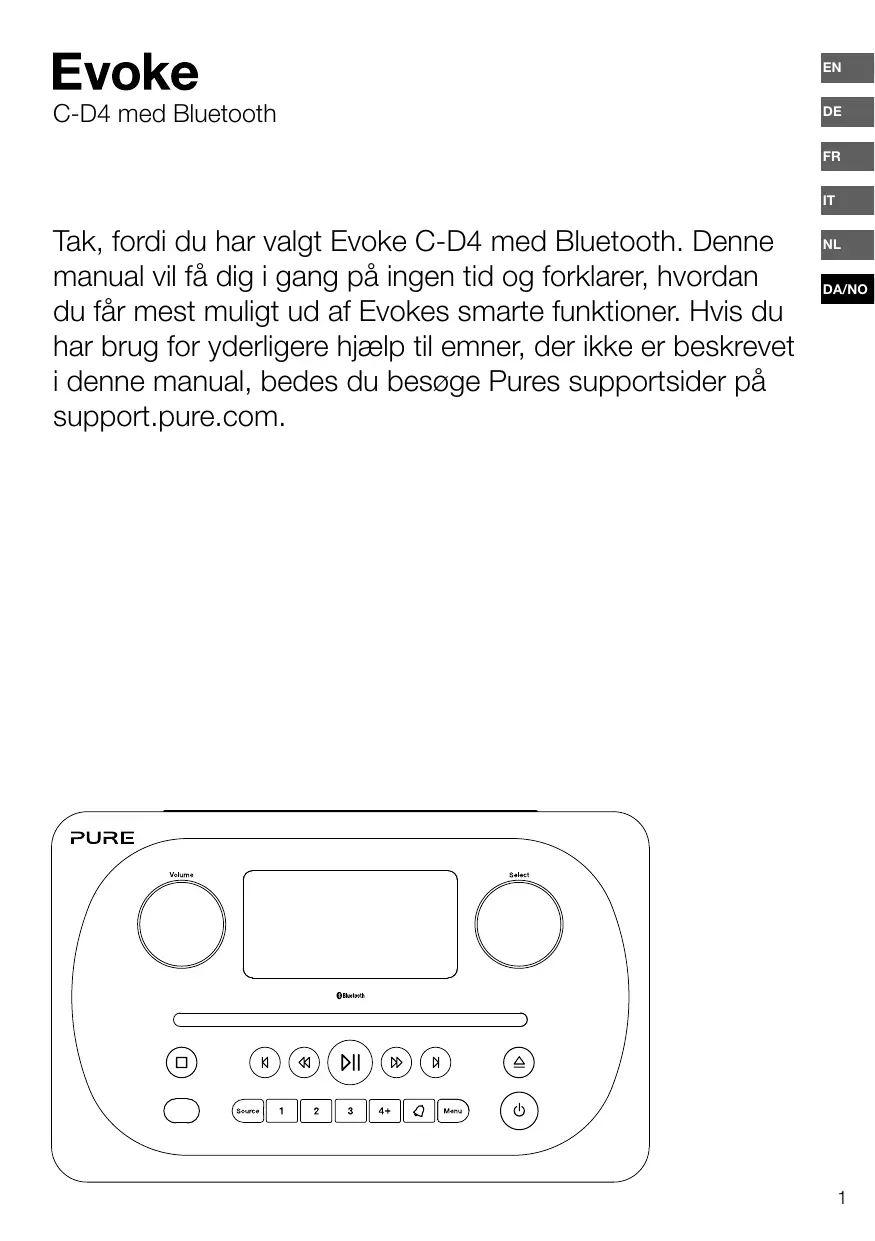 Tak, fordi du har valgt Evoke C-D4 med Bluetooth. Denne manual vil få dig i gang på ingen tid og forklarer, hvordan du får mest muligt ud af Evokes smarte funktioner. Hvis du har brug for yderligere hjælp til emner, der ikke er beskrevet i denne manual, bedes du besøge Pures supportsider på support.pure.com.