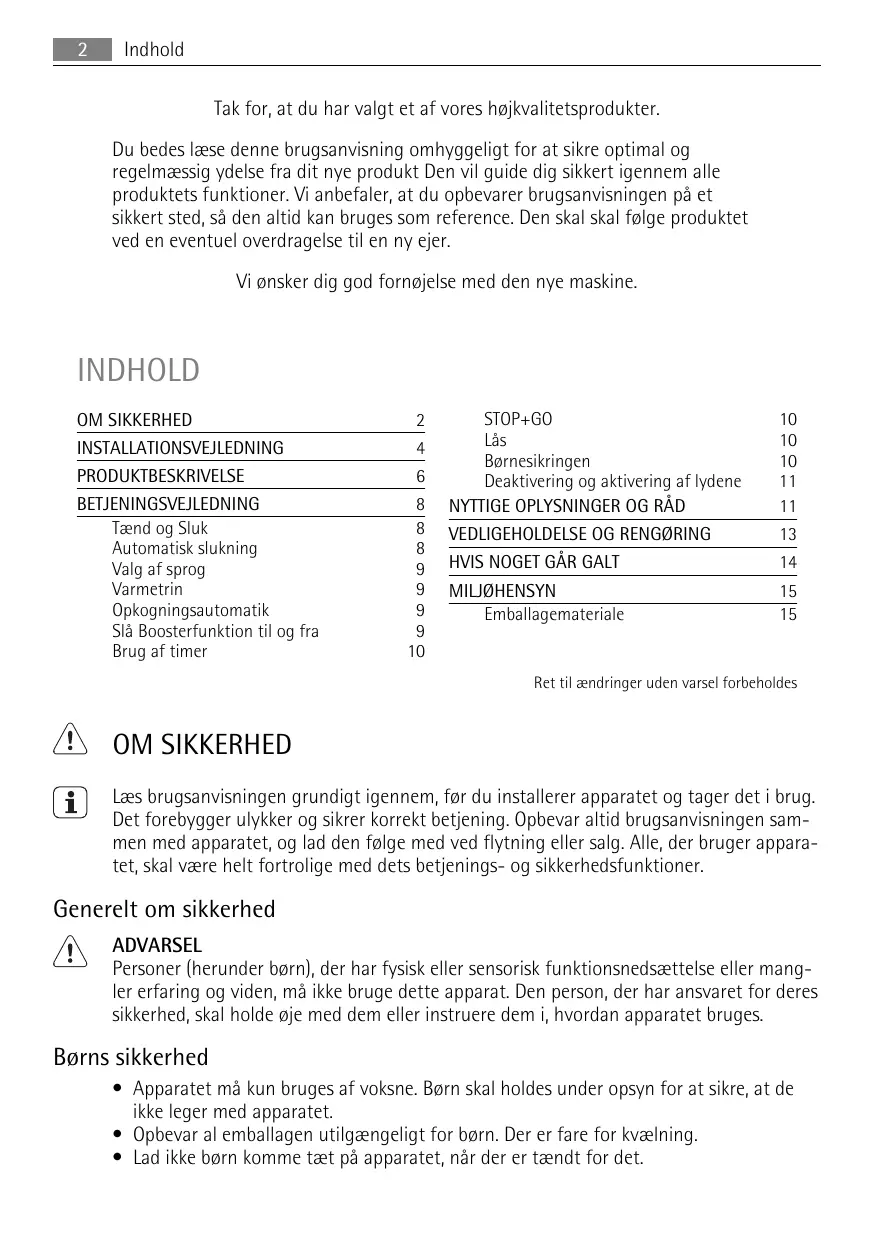 OM SIKKERHED Læs brugsanvisningen grundigt igennem, før du installerer apparatet og tager det i brug. Det forebygger ulykker og sikrer korrekt betjening. Opbevar altid brugsanvisningen sammen med apparatet, og lad den følge med ved flytning eller salg. Alle, der bruger apparatet, skal være helt fortrolige med dets betjenings- og sikkerhedsfunktioner.