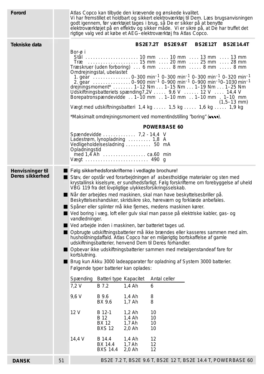 - BS2E 7.2 T, BS2E 9.6 T, BS2E 12 T, BS2E 14.4 T, POWERBASE 60 Forord Atlas Copco kan tilbyde den krævende og ønskede kvalitet. Vi har fremstillet et holdbart og sikkert elektroværktøj til Dem. Læs brugsanvisningen godt igennem, før værktøjet tages i brug, så De er sikker på at benytte elektroværktøjet på en effektiv og sikker måde. Vi er sikre på, at De har truffet det rigtige valg ved at købe et AEG–elektroværktøj fra Atlas Copco. Tekniske data BS2E7.2T BS2E9.6T BS2E12T BS2E14.4T Bor-ø i Stål p. 10