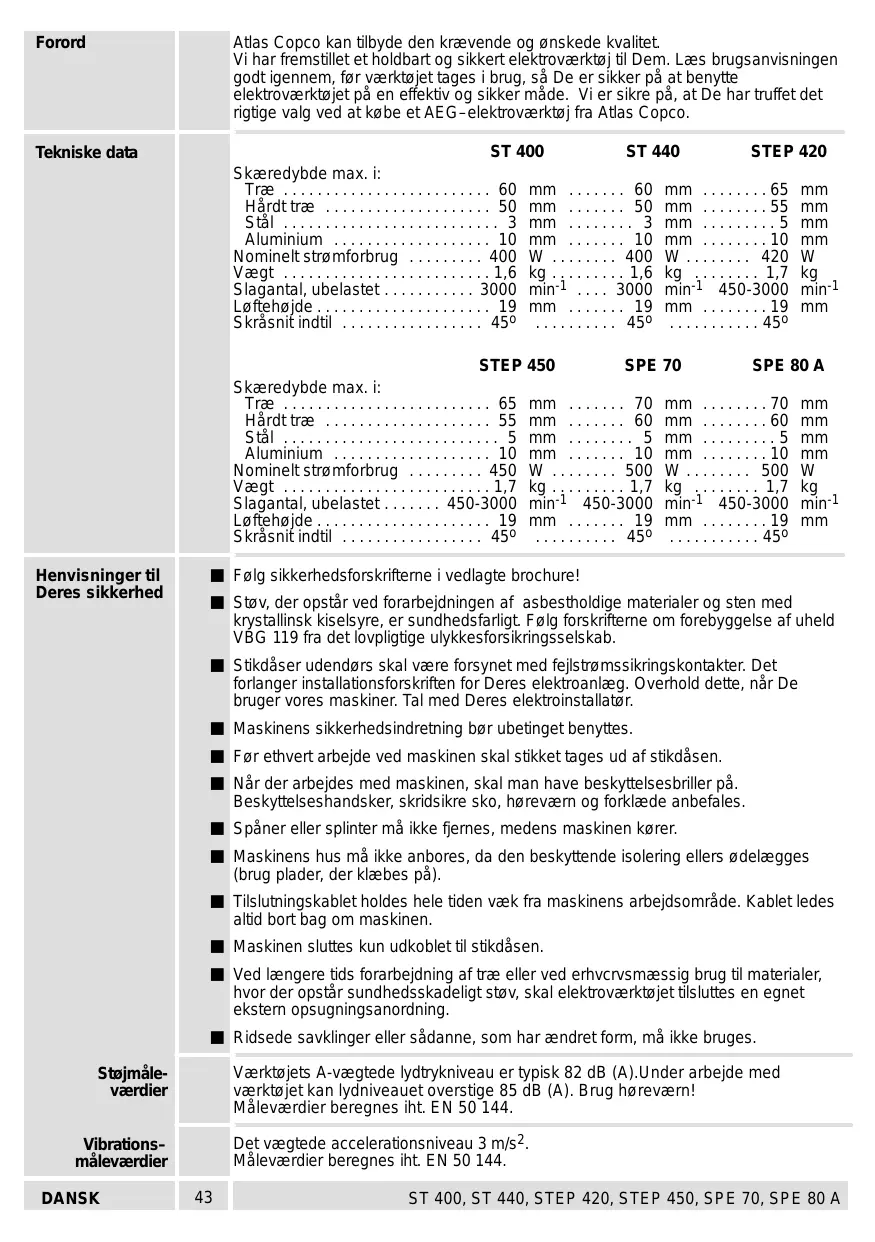 - ST 400, ST 440, STEP 420, STEP 450, SPE 70, SPE 80 A Forord Atlas Copco kan tilbyde den krævende og ønskede kvalitet. Vi har fremstillet et holdbart og sikkert elektroværktøj til Dem. Læs brugsanvisningen godt igennem, før værktøjet tages i brug, så De er sikker på at benytte elektroværktøjet på en effektiv og sikker måde. Vi er sikre på, at De har truffet det rigtige valg ved at købe et AEG–elektroværktøj fra Atlas Copco. Tekniske data ST 400 ST 440 STEP 420 Skæredybde max. i: Træ p. 60