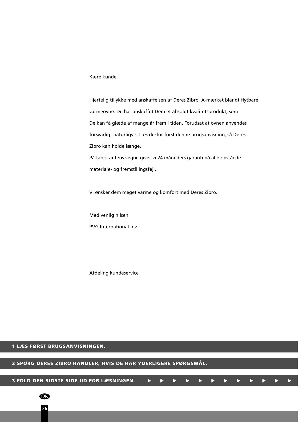 Kære kunde Hjertelig tillykke med anskaffelsen af Deres Zibro, A-mærket blandt flytbare varmeovne. De har anskaffet Dem et absolut kvalitetsprodukt, som De kan få glæde af mange år frem i tiden. Forudsat at ovnen anvendes forsvarligt naturligvis. Læs derfor først denne brugsanvisning, så Deres Zibro kan holde længe. På fabrikantens vegne giver vi 24 måneders garanti på alle opståede materiale- og fremstillingsfejl. Vi ønsker dem meget varme og komfort med Deres Zibro. Med venlig hilsen PVG International b.v. Afdeling kundeservice 1 LÆS FØRST BRUGSANVISNINGEN. 2 SPØRG DERES ZIBRO HANDLER, HVIS DE HAR YDERLIGERE SPØRGSMÅL. 3 FOLD DEN SIDSTE SIDE UD FØR LÆSNINGEN.