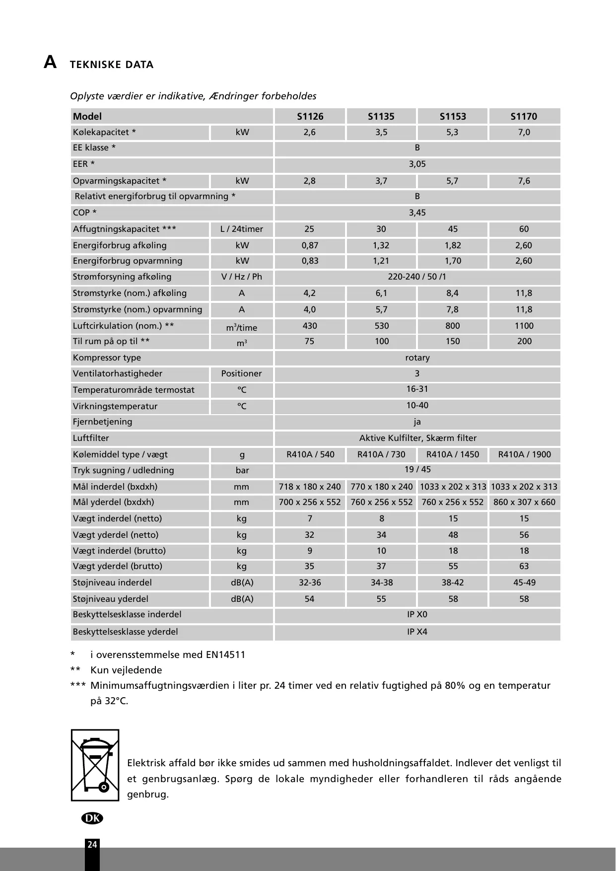 ** Kun vejledende *** Minimumsaffugtningsværdien i liter pr. 24 timer ved en relativ fugtighed på 80% og en temperatur på 32°C.