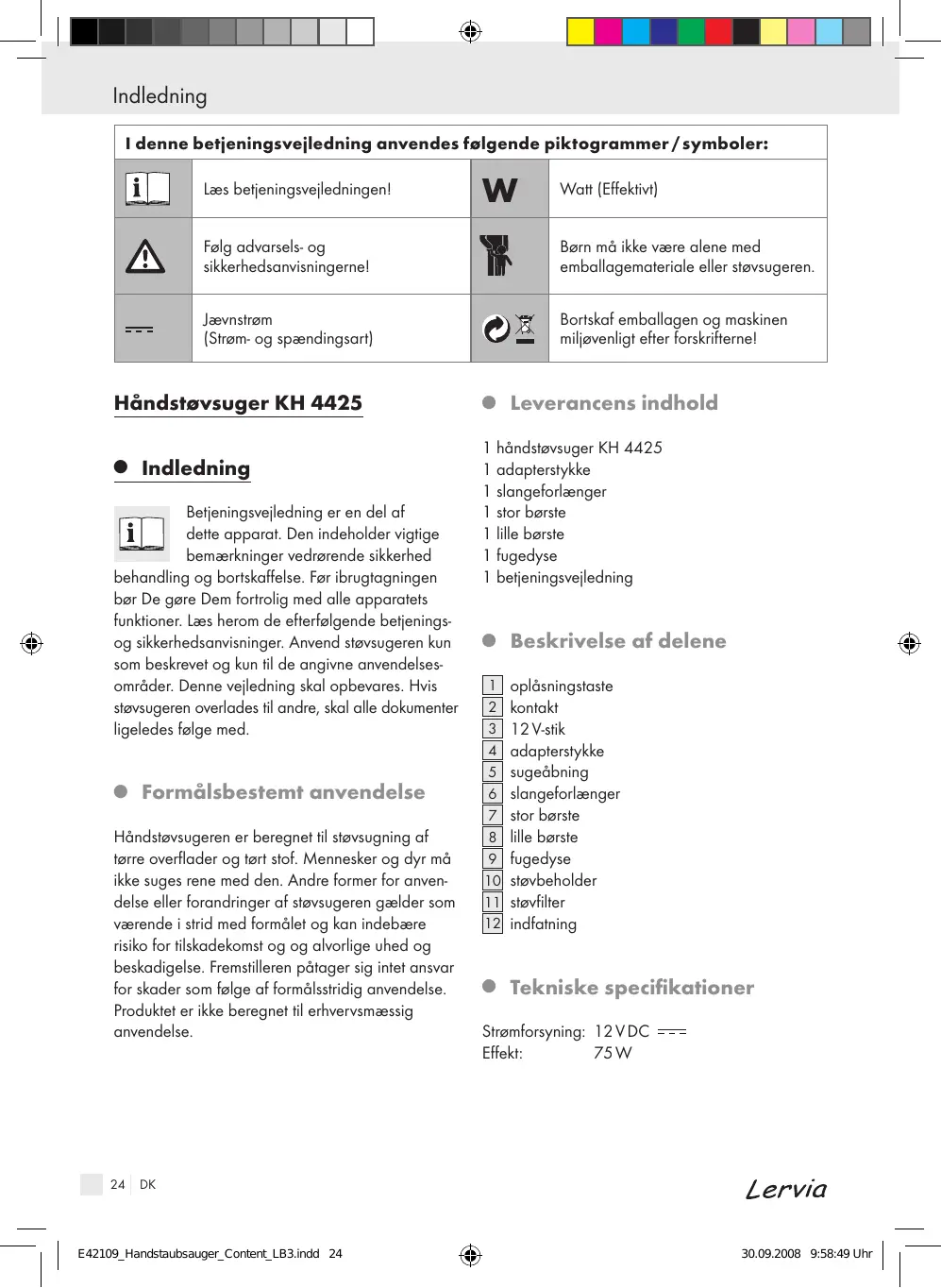 Händstavsugeren er beregnet til stavsugning af tgrre overflader og tart stof. Mennesker og dyr mà ikke suges rene med den. Andre former for anven- delse eller forandringer af stavsugeren gælder som værende i strid med formälet og kan indebære risiko for tilskadekomst og og alvorlige uhed og beskadigelse. Fremstilleren pâtager sig intet ansvar for skader som falge af formälsstridig anvendelse. Produktet er ikke beregnet til erhvervsmæssig
