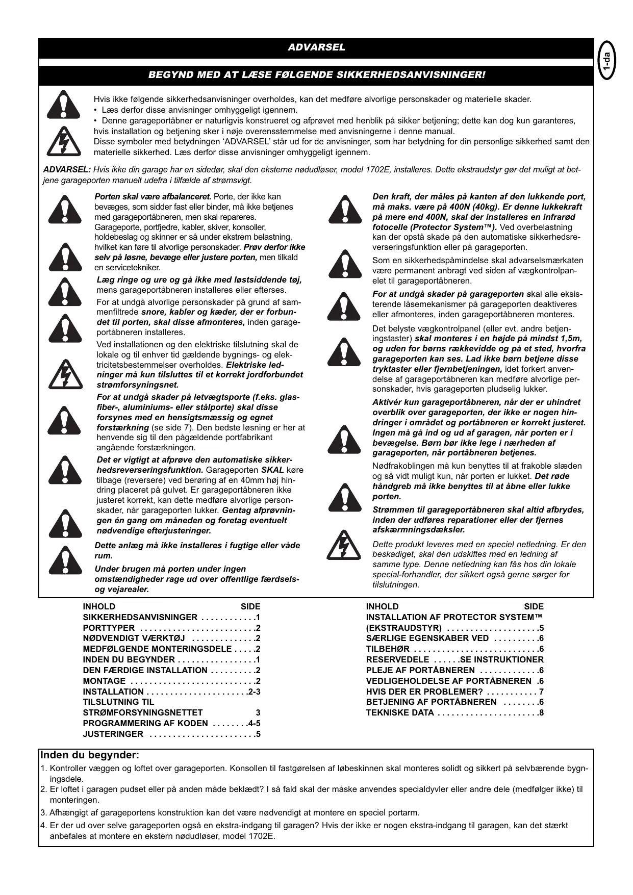 INHOLD SIDE INSTALLATION AF PROTECTOR SYSTEM™ (EKSTRAUDSTYR) . . . . . . . . . . . . . . . . . . . .5 SÆRLIGE EGENSKABER VED . . . . . . . . . .6 TILBEHØR . . . . . . . . . . . . . . . . . . . . . . . . . . .6 RESERVEDELE . . . . . .SE INSTRUKTIONER PLEJE AF PORTÅBNEREN . . . . . . . . . . . . .6 VEDLIGEHOLDELSE AF PORTÅBNEREN .6 HVIS DER ER PROBLEMER? . . . . . . . . . . . 7 BETJENING AF PORTÅBNEREN . . . . . . . .6 TEKNISKE DATA . . . . . . . . . . . . . . . . . . . . . .8