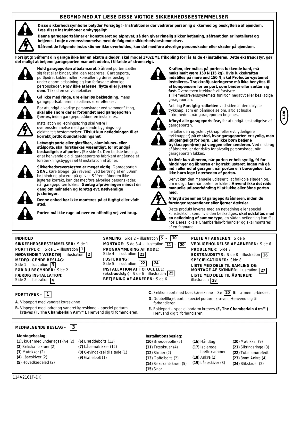 per the provisions & all amendments of the EU Directives ..................................................1999/5/EC, 73/23/EEC, 89/336/EEC Declaration of Incorporation Automatic Garage Door Opener Model No. 2000ML, when installed and maintained according to all the Manufacturer’s instructions in combination with a Garage Door, which has also been installed and maintained according to all the Manufacturer’s instructions, meet the provisions of EU Directive 89/392/EEC and all amendments. I, the undersigned, hereby declare that the equipment specified above and any accessory listed in the manual conforms to the above Directives and Standards. THE CHAMBERLAIN GROUP, INC. Elmhurst, IL 60126 USA May, 2003 114A2161F © 2003, Chamberlain GmbH All rights reserved Barbara P. Kelkhoff Manager, Reg. Affairs 7-GB ACCESSORIES – 26 BEGYND MED AT LÆSE DISSE VIGTIGE SIKKERHEDSBESTEMMELSER Disse sikkerhedssymboler betyder Forsigtig! - Instruktioner der vedrører personlig sikkerhed og beskyttelse af ejendom. Læs disse instruktioner omhyggeligt. Denne garageportsåbner er konstrueret og afprøvet, så den giver rimelig sikker betjening, såfremt den er installeret og betjenes i nøje overensstemmelse med de følgende sikkerhedsbestemmelser. Såfremt de følgende instruktioner ikke overholdes, kan det medføre alvorlige personskader eller skader på ejendom. Forsigtig! Såfremt din garage ikke har en ekstra sidedør, skal model 1702EML frikobling for lås (side 4) installeres. Dette ekstraudstyr, gør det muligt at betjene garageporten manuelt udefra, i tilfælde af strømsvigt. Gå ikke med ringe, ure eller løs beklædning, mens garageportsåbneren installeres eller efterses. For at undgå alvorlige personskader ved sammenfiltring, skal alle snore der er forbundet med garageporten fjernes, inden garageportsåbneren installeres. Installation og ledningsføring skal være i overensstemmelse med gældende bygnings- og elektricitetsbestemmelser. Tilslut kun netledningen til et korrekt jordforbundet ledningsnet. Letvægtsporte eller glasfiber-, aluminiums- eller stålporte, skal forstærkes væsentligt, for at undgå beskadigelse af porten. (Se side 4). Den bedste løsning, er at henvende dig til garageportens fabrikant angående et forstærkningsbyggesæt til installation af åbner. Kraften, der måles på portens lukkende kant, må maksimalt være 150 N (15 kg). Hvis lukkekraften indstilles på mere end 150 N, skal Protector-systemet installeres. Trækkraftjusteringerne må ikke benyttes til at kompensere for en port, som binder eller sætter sig fast. Overdreven trækkraft vil forstyrre sikkerhedsreverssystemets funktion negativt eller beskadige garageporten. Anbring Forsigtig -etiketten ved siden af den oplyste trykknap, som en påmindelse om, altid at huske sikkerheden, når garageporten betjenes. Afbryd alle garageportslåse, for at undgå beskadigelse af garageporten. Installér den oplyste trykknap (eller evt. yderligere trykknapper) på et sted, hvor garageporten er synlig, men utilgængeligt for børn. Lad ikke børn betjene trykknappen(rne) på væggen eller senderen. Ved misbrug af åbneren, er der risiko for alvorlig personskade, når garageporten lukkes. Aktivér kun åbneren, når porten er helt synlig, fri for hindringer og åbneren er korrekt justeret. Ingen må gå ind i eller ud af garagen, når porten er i bevægelse. Lad ikke børn lege i nærheden af porten. Sikkerhedsreverstesten er meget vigtig. Garageporten SKAL køre tilbage (gå i revers), ved berøring af en 50mm høj hindring placeret på gulvet. Såfremt åbneren ikke justeres korrekt, kan det medføre alvorlige personskader, når garageporten lukkes. Gentag afprøvningen mindst én gang om måneden og foretag evt. nødvendige justeringer. Benyt kun den manuelle udløser til at frakoble slæden og, om muligt, kun når porten er lukket. Anvend ikke det røde manuelle udløserhåndtag til at lukke eller åbne porten med. Denne enhed bør ikke monteres på et fugtigt eller vådt sted. Afbryd strømmen til garageportsåbneren, inden du foretager reparationer eller fjerner dæksler. Porten må ikke rage ud over en offentlig vej ved brug. INDHOLD SIKKERHEDSBESTEMMELSER: Side 1 PORTTYPER: Side 1 – illustration 1 NØDVENDIGT VÆRKTØJ: illustration 2 MEDFØLGENDE BESLAG: Side 1 – illustration 3 FØR DU BEGYNDER: Side 2 FÆRDIG INSTALLATION: Side 2 – Illustration 4 PORTTYPER – SAMLING: Side 2 – illustration 5 – 10 MONTAGE: Side 3-4 – illustration 11 – 20 PROGRAMMERING AF KODE: Side 4 – illustration 21 JUSTERUNG: Side 5 – illustration 22 – 24 INSTALLATION AF FOTOCELLE: (ekstraudstyr): Side 6 – illustration 25 BETJENING AF ÅBNEREN: Side 6