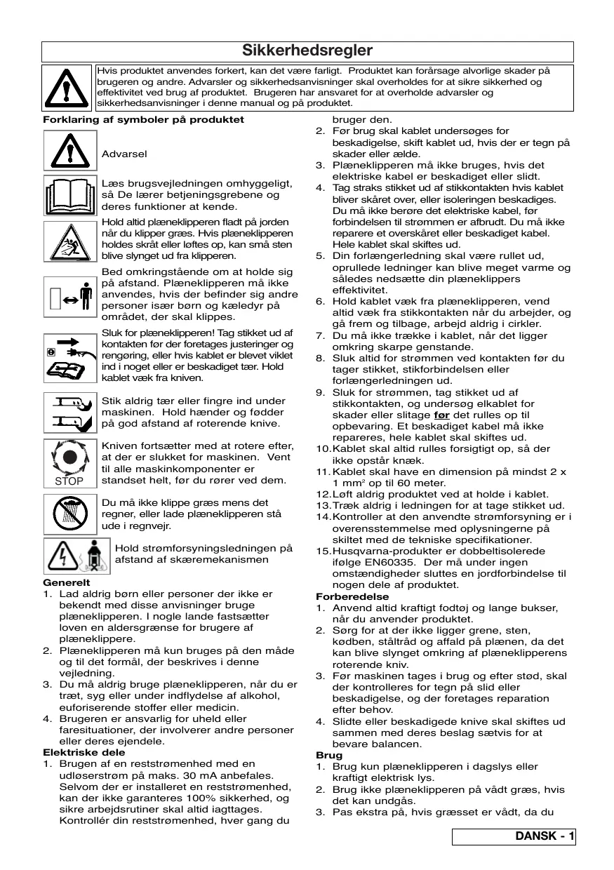 - Varning! Husqvarna Outdoor Products ansvarar ej under denna garanti för fel som direkt eller indirekt uppstått efter att reservdelar som inte har tillverkats eller godkänts av Husqvarna Outdoor Products monterats på maskinen eller om maskinen har modifierats på något sätt. Sikkerhedsregler Hvis produktet anvendes forkert, kan det være farligt. Produktet kan forårsage alvorlige skader på brugeren og andre. Advarsler og sikkerhedsanvisninger skal overholdes for at sikre sikkerhed og effektivitet ved brug af produktet. Brugeren har ansvaret for at overholde advarsler og sikkerhedsanvisninger i denne manual og på produktet. Forklaring af symboler på produktet Advarsel Læs brugsvejledningen omhyggeligt, så De lærer betjeningsgrebene og deres funktioner at kende. Hold altid plæneklipperen fladt på jorden når du klipper græs. Hvis plæneklipperen holdes skråt eller løftes op, kan små sten blive slynget ud fra klipperen. Bed omkringstående om at holde sig på afstand. Plæneklipperen må ikke anvendes, hvis der befinder sig andre personer især børn og kæledyr på området, der skal klippes. Sluk for plæneklipperen! Tag stikket ud af kontakten før der foretages justeringer og rengøring, eller hvis kablet er blevet viklet ind i noget eller er beskadiget tær. Hold kablet væk fra kniven. Stik aldrig tær eller fingre ind under maskinen. Hold hænder og fødder på god afstand af roterende knive. STOP Kniven fortsætter med at rotere efter, at der er slukket for maskinen. Vent til alle maskinkomponenter er standset helt, før du rører ved dem. Du må ikke klippe græs mens det regner, eller lade plæneklipperen stå ude i regnvejr. Hold strømforsyningsledningen på afstand af skæremekanismen Generelt