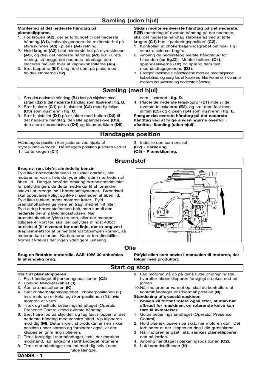 (C2) - Parkering (C3) - Plæneklipning. Brændstof Brug ny, ren, blyfri, almindelig benzin Fyid ikke brændstoftanken i et lukket omräde, när motoren er varm, hvis du ryger eller stär i nærheden af äben ild. Rengor omrädet omkring brændstofsdæksiet for päfyldningen, da dette medvirker til at forhinare snavs i at trænge ind i brændstofsystemet. Brændstof skal opbevares koligt og ikke 1 nærheden af äben ild Fyid iKke tanken, mens motoren korer. Fyld brændstoftanken gennem en tragt med et fint filter. Fyid aldrig brændstoftanken helt, men kun til den nederste del af päfyldningsstudsen. När brændstoftanken fyldes fra tom, eller när motoren tidligere er kart tar, skal der päfyldes mindst 400cc brændstof (til niveauet for den linje, der er angivet i diagrammet) for at prime brændstofpumpen korrekt, sà motoren kan startes. Karburatoren er forudindstillet Normal kræves der ingen yderligere justering. [ Olie Brug en firetakts motorolie. SAE 10W-30 anbefales til almindelig brug. Päfyid olien som anvist i manualen til motoren, der folger med produktet. [ Start og stop Start af plæneklipperen