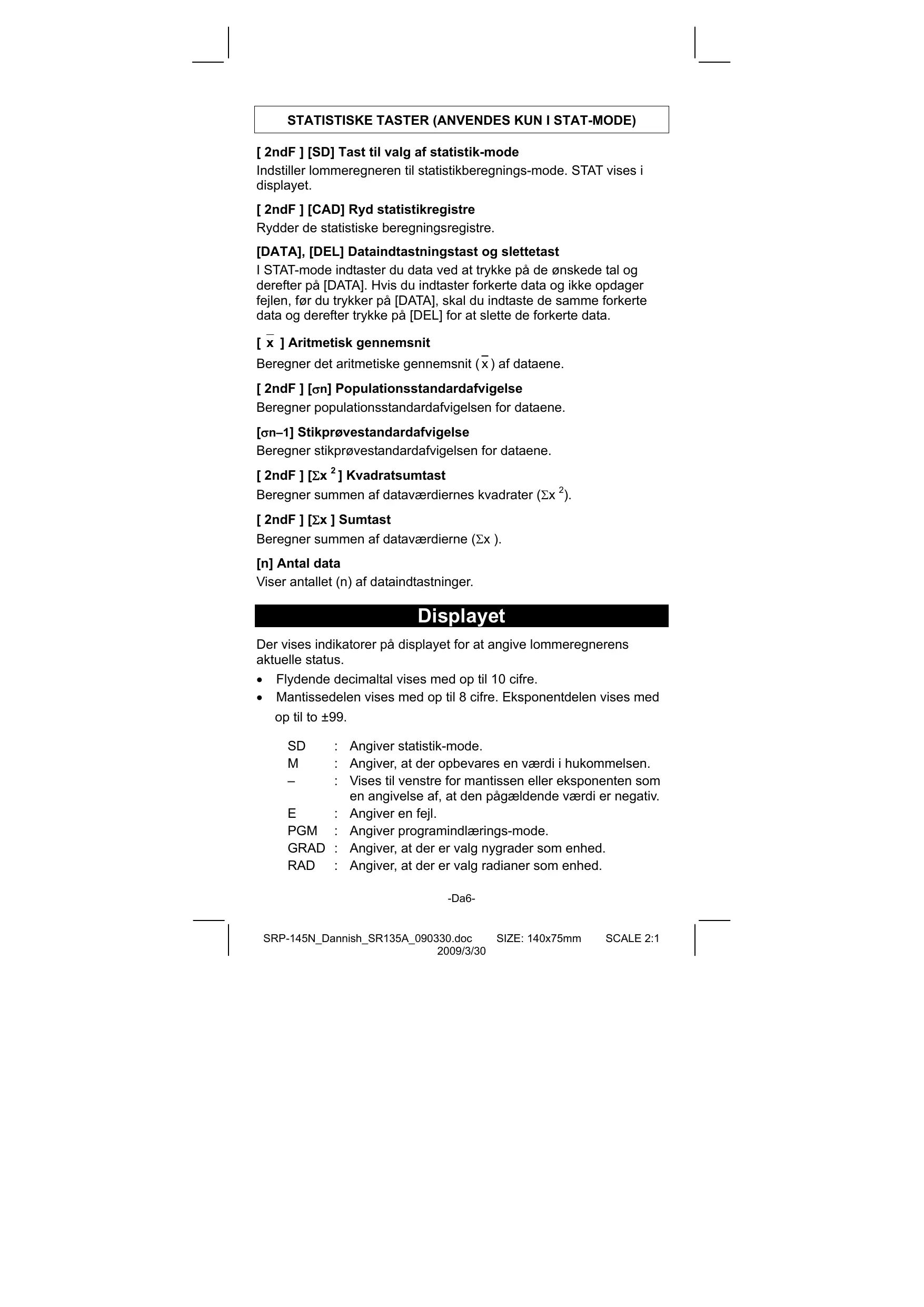 : Angiver statistik-mode. : Angiver, at der opbevares en værdi i hukommelsen. : Vises til venstre for mantissen eller eksponenten som en angivelse af, at den pågældende værdi er negativ. : Angiver en fejl. PGM : Angiver programindlærings-mode. GRAD : Angiver, at der er valg nygrader som enhed. RAD : Angiver, at der er valg radianer som enhed. -Da6- SRP-145N_Dannish_SR135A_090330.doc SIZE: 140x75mm 2009/3/30 SCALE 2:1 DEG HYP