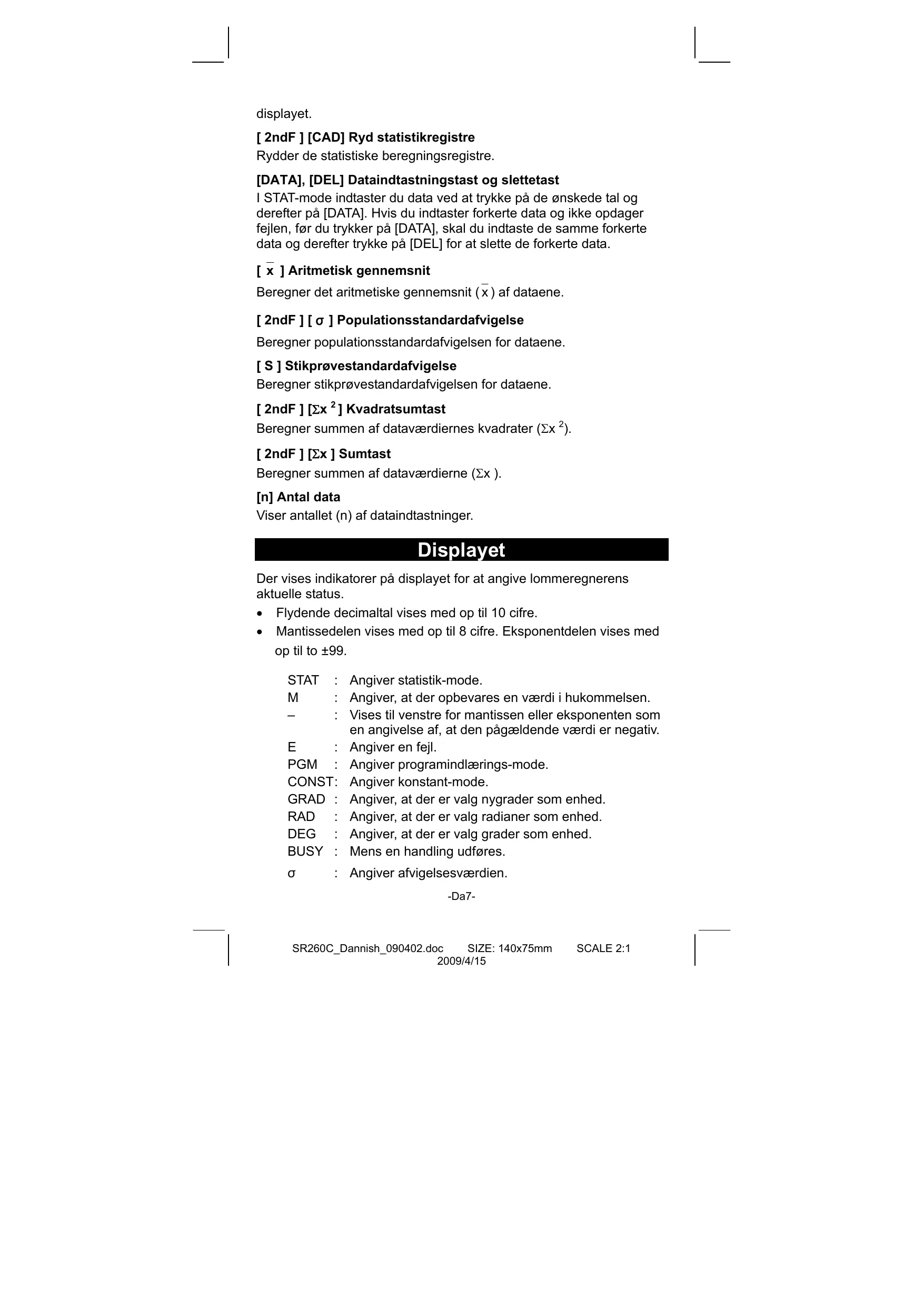 - Et midlertidigt eller endeligt beregningsresultat overstiger 1 x 10 100 -Da9- SR260C_Dannish_090402.doc SIZE: 140x75mm 2009/4/15 SCALE 2:1 (inklusive hukommelsesberegninger).