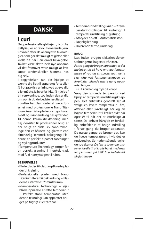 - Isolerende termo-underlag DANSK i curl Det professionelle glattejern, i curl fra BaByliss, er et revolutionerende jern, udviklet efter de allernyeste teknologier, som gør det muligt at glatte eller krølle dit hår i en enkel bevægelse. Takket være dette helt nye apparat, vil det fremover være muligt at lave super tendenskrøller hjemme hos dig selv. I begyndelsen kan det hjælpe at vænne dig lidt til apparatet først eller få lidt praktisk erfaring ved at øve dig eller måske, ja hvorfor ikke, få hjælp af en ven/veninde. ..og inden du ser dig om opnår du de bedste resultater! i curl’en har den fordel at være forsynet med professionelle Nano Titanium Keramiske plader som gør håret blødt og skinnende og beskytter det. Til denne keramikbeklædning med høj densitet til professionel brug er der brugt en eksklusiv nano-teknologi: den er hårdere og glattere end almindelig keramisk belægning. Pladerne er perfekt tilpasset farvninger og stylingprodukter. i Temperature Technology sørger for en perfekt glatning i 1 enkelt træk med fuld hensyntagen til håret. BRUG Læs inden brugen sikkerhedsforanstaltningerne bagerst i afsnittet. Første gang du bruger apparatet, er det muligt at du vil have en svag fornemmelse af røg og en speciel lugt: dette sker ofte ved førstegangsbrugen og forsvinder allerede næste gang apparatet bruges. Tilslut i curl’en og tryk på knap I. Vælg den ønskede temperatur ved hjælp af temperaturindstillingsknappen. Det anbefales generelt set at vælge en lavere temperatur til fint, affarvet eller skrøbeligt hår og en højere temperatur til krøllet, tykt hår og/eller til hår der er vanskeligt at sætte. Da enhver hårtype er forskellig, anbefaler vi at bruge indstilling