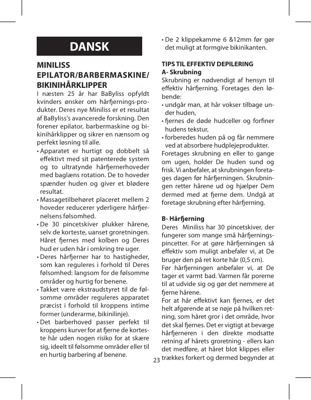 MINILISS EPILATOR/BARBERMASKINE/ BIKINIHÂRKLIPPER 1 næsten 25 är har BaByliss opfyldt kvinders ensker om härfjernings-pro- dukter. Deres nye Miniliss er et resultat af BaByliss avancerede forskning. Den forener epilator, barbermaskine og bi- kinihérklipper og sikrer en nænsom og perfektlasning til alle. + Apparatet er hurtigt og dobbelt sà effektivt med sit patenterede system og to ultratynde härfjemerhoveder med baglæns rotation. De to hoveder spænder huden og giver et bladere resultat + Massagetilbehoret placeret mellem 2 hoveder reducerer yderligere härfer- nelsens folsomhed. +De 30 pincetskiver plukker härene, selv de korteste, uanset groretningen. Häret fjernes med kolben og Deres hud er uden hâri omkring tre uger. +Deres härfjerner har to hastigheder, som kan reguleres i forhold til Deres folsomhed:langsom for de folsomme omräder og hurtig for benene. + Takket være ekstraudstyret til de fol- somme omräder reguleres apparatet præcist i forhold til kroppens intime former (underarme, bikinilinje). +Det barberhoved passer perfekt til kroppens kurver for at fjerne de kortes- te hér uden nogen risiko for at skære Sig, ideelt til falsomme omräder eller til en hurtig barbering af benene. +De 2 klippekamme 6 &12mm far ger det muligt at formgive bikinikanten.