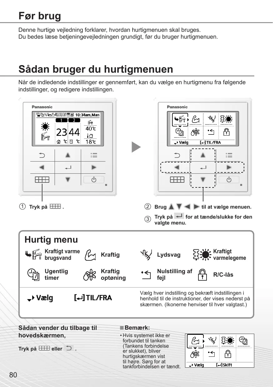 Denne hurtige vegledning forklarer, hvordan hurtigmenuen skal bruges. Du bedes lese betjeningeveledningen grundigt, før du bruger hurtigmenuen.