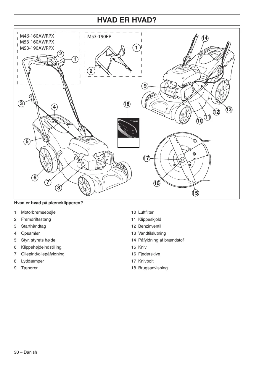 Hvad er hvad pà plæneklipperen? 1 Motorbremsebojle 10 Luftfilter 2 Fremdrifisstang 11 Klippeskjold 3 Starthändtag 12 Benzinventil 4 Opsamier 13 Vandiilslutning 5 Styr,styrets hojde 14 Päfyldning af brændstof 6 Kippehojdeindstiling 15 Kniv 7 Oliepind/oliepäfyldning 16 Fjederskive 8 Lyddæmper 17 Knivboit 9 Tændror 18 Brugsanvisning