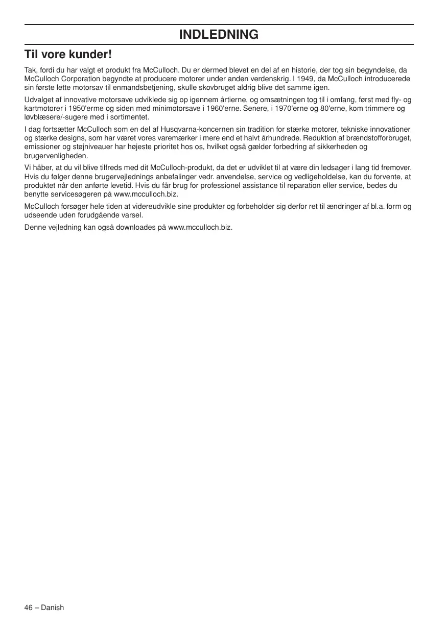 ADVARSEL! Langvarig eksponering for støj kan medføre permanente høreskader. Brug derfor altid godkendt høreværn. ADVARSEL! Maskinens oprindelige udformning må under ingen omstændigheder ændres uden producentens samtykke. Brug altid originaltilbehør. Ikke-autoriserede ændringer og/eller ikke-godkendt tilbehør kan medføre alvorlige skader eller døden for brugeren eller andre. ADVARSEL! En rydningssav, buskrydder eller trimmer kan, hvis den bruges forkert eller skødesløst, være et farligt redskab, som kan forårsage alvorlige skader eller dødsfald for brugeren eller andre. Det er meget vigtigt, at du læser og forstår indholdet i denne brugsanvisning. Danish – 45 INDLEDNING Til vore kunder! Tak, fordi du har valgt et produkt fra McCulloch. Du er dermed blevet en del af en historie, der tog sin begyndelse, da McCulloch Corporation begyndte at producere motorer under anden verdenskrig. I 1949, da McCulloch introducerede sin første lette motorsav til enmandsbetjening, skulle skovbruget aldrig blive det samme igen. Udvalget af innovative motorsave udviklede sig op igennem årtierne, og omsætningen tog til i omfang, først med fly- og kartmotorer i 1950'erme og siden med minimotorsave i 1960'erne. Senere, i 1970'erne og 80'erne, kom trimmere og løvblæsere/-sugere med i sortimentet. I dag fortsætter McCulloch som en del af Husqvarna-koncernen sin tradition for stærke motorer, tekniske innovationer og stærke designs, som har været vores varemærker i mere end et halvt århundrede. Reduktion af brændstofforbruget, emissioner og støjniveauer har højeste prioritet hos os, hvilket også gælder forbedring af sikkerheden og brugervenligheden. Vi håber, at du vil blive tilfreds med dit McCulloch-produkt, da det er udviklet til at være din ledsager i lang tid fremover. Hvis du følger denne brugervejlednings anbefalinger vedr. anvendelse, service og vedligeholdelse, kan du forvente, at produktet når den anførte levetid. Hvis du får brug for professionel assistance til reparation eller service, bedes du benytte servicesøgeren på www.mcculloch.biz. McCulloch forsøger hele tiden at videreudvikle sine produkter og forbeholder sig derfor ret til ændringer af bl.a. form og udseende uden forudgående varsel. Denne vejledning kan også downloades på www.mcculloch.biz. 46 – Danish HVAD ER HVAD?