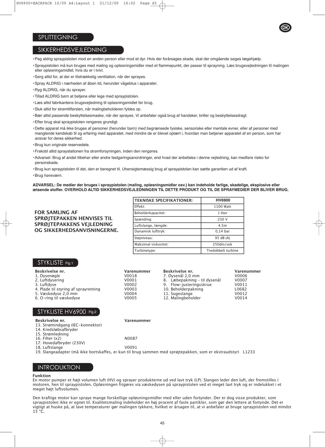 BEMÆRK: Vi har gjort alt, hvad vi kan, for at sikre, at denne spraypistol vil få et langt og problemfrit liv, hvis den bruges korrekt og i overensstemmelse med instruktionerne,. Vi tager ikke ansvar for skader, der skyldes brug af forkerte eller uegnede substanser, malingstyper eller væsker, som ikke er blevet korrekt fortyndet, eller er uegnede til de overflader, de påføres, sundhedsrisici, der kommer fra mangel på ventilation under arbejde i lukkede områder eller fejl ved udstyret, der skyldes utilstrækkelig rengøring af komponenterne efter brug. I tvivlstilfælde bør der udføres en test på et lille, ikke iøjnefaldende sted først. Læs altid fabrikantens brugsvejledning før brug. Hverken vores garanti eller ovennævnte erklæring berører dine lovbestemte rettigheder