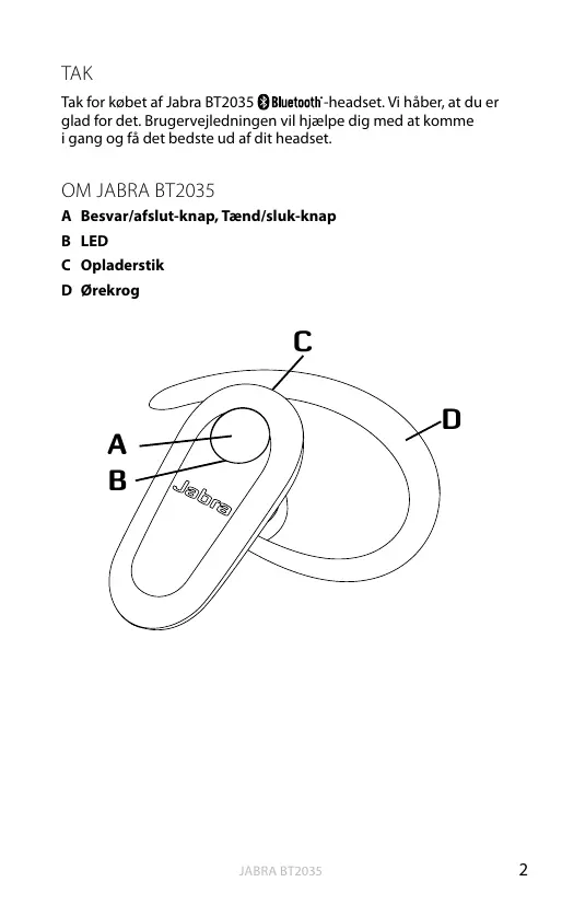 Sådan foretager du et opkald - Når du foretager et opkald fra mobiltelefonen, overføres opkaldet (afhængigt af telefonens indstillinger) automatisk til headsettet. Hvis telefonen ikke understøtter denne funktion, skal du trykke let på besvar/afslut-knappen på Jabra BT2035 for at modtage opkaldet i headsettet. Sådan afviser du et opkald* - Tryk på besvar/afslut-knappen, når telefonen ringer, for at afvise et indgående opkald. Den, der ringer til dig, vil, afhængigt af telefonens indstillinger, blive viderestillet til telefonsvareren eller høre en optaget-tone. Sådan aktiverer du stemmeopkald* - Tryk på besvar/afslut-knappen. Resultatet bliver bedst, hvis du optager stemmekoden via headsettet, forudsat at denne funktion understøttes af telefonen. Du kan få flere oplysninger om denne funktion i brugervejledningen til telefonen. Sådan ringer du til det sidst opkaldte nummer* - Tryk let på besvar/afslut-knappen to gange. Sådan sætter du et opkald i venteposition eller parkerer et opkald* Disse funktioner gør det muligt at parkere en samtale og besvare et ventende opkald. - Tryk på besvar/afslut-knappen én gang for at parkere det aktive opkald og besvare det ventende. - Tryk på besvar/afslut-knappen for at skifte mellem de to opkald. - Tryk let på besvar/afslut-knappen for at afslutte den aktive samtale. - refuser des appels* - lancer une numérotation vocale* - rappeler le dernier numéro* - prendre un double appel* - mettre un appel en attente* Spécifications - Jusqu’à 7 h de temps de communication/200 h en mode veille - Batterie rechargeable compatible avec tout chargeur d’alimentation en courant alternatif, câble USB ou chargeur de voiture (câble USB et chargeur de voiture non fournis) - Poids : 11 g Veuillez noter que la durée de vie de la batterie sera considérablement réduite si votre appareil reste déchargé pendant une longue période. Par conséquent, nous vous recommandons de le recharger au moins une fois par mois.