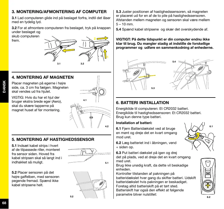 Efter installation og inden du bruger din computer første gang, er det nødvendigt at udføre den digitale synkronisering af enhederne, som beskrevet i punkt 9 i denne manual. Uden denne synkronisering er der ingen kommunikation mellem computeren og de forskellige sensorer, og systemet vil ikke virke. DANSK